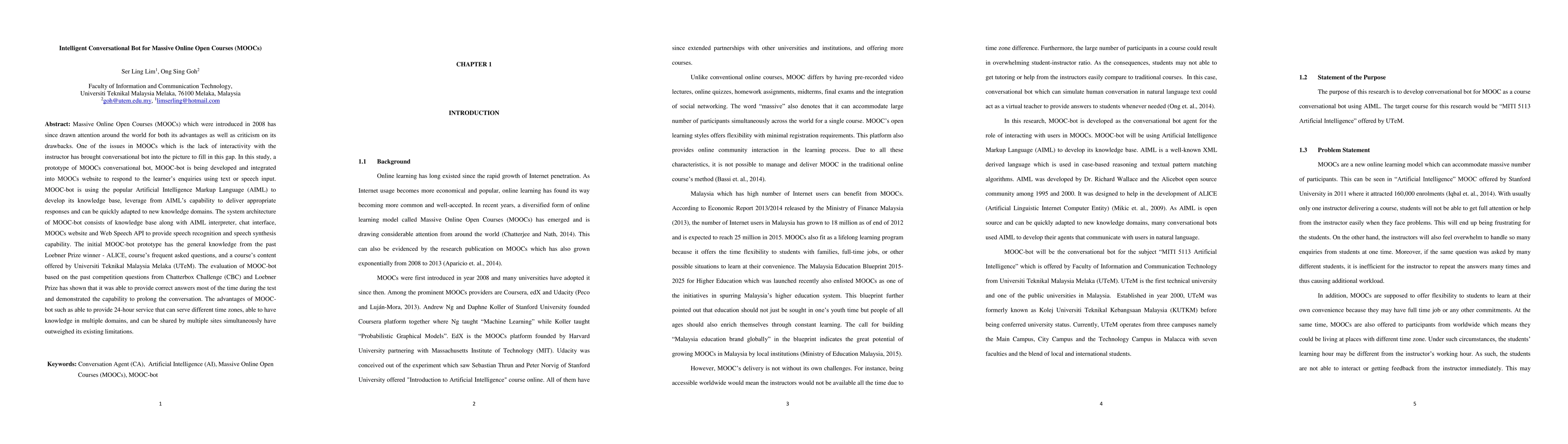 This study develops MOOC-bot, an intelligent conversational bot integrated into MOOCs to address the lack of instructor interactivity. Utilizing AIML, MOOC-bot responds to learner inquiries via text or speech, showcasing its ability to provide correct answers and sustain conversations, while offering 24-hour service across multiple domains and time zones.