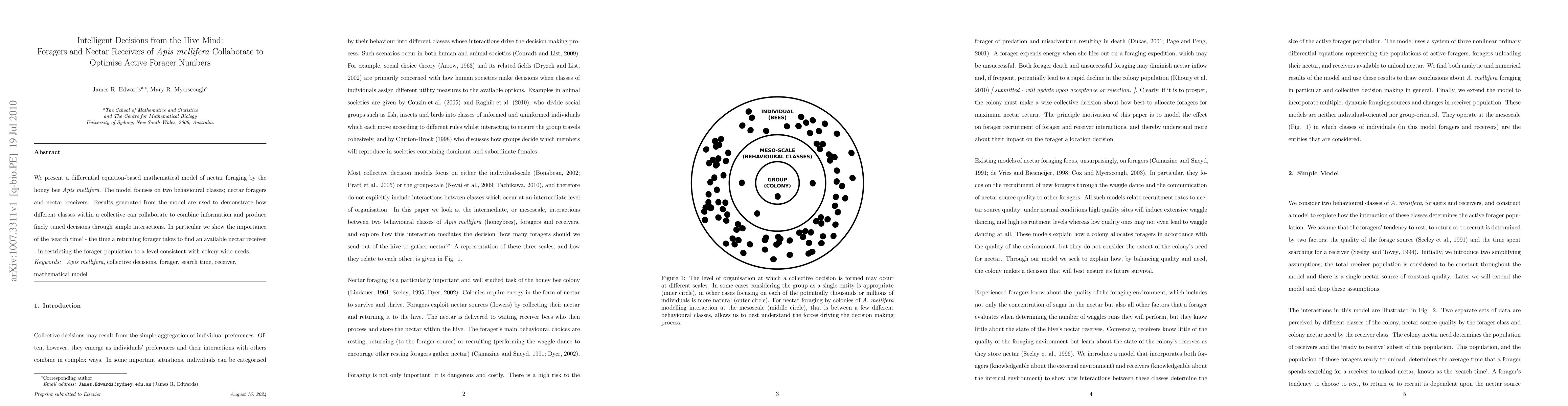 We present a differential equation-based mathematical model of nectar foraging by the honey bee Apis mellifera. The model focuses on two behavioural classes; nectar foragers and nectar receivers. Results generated from the model are used to demonstrate how different classes within a collective can collaborate to combine information and produce finely tuned decisions through simple interactions. In particular we show the importance of the `search time' - the time a returning forager takes to find an available nectar receiver - in restricting the forager population to a level consistent with colony-wide needs.