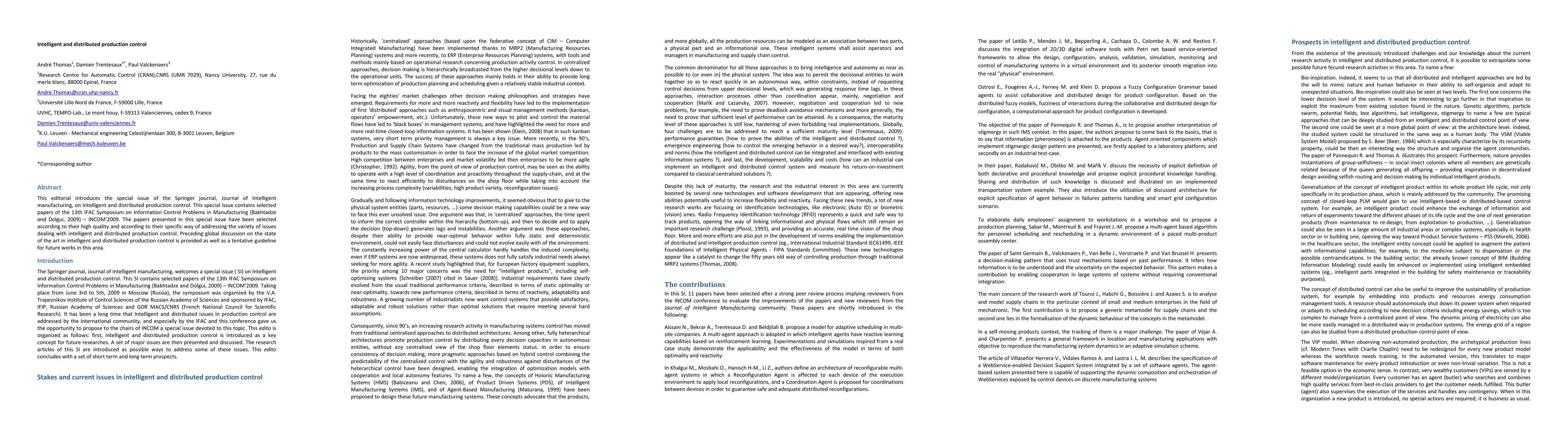 This editorial introduces the special issue of the Springer journal, Journal of Intelligent Manufacturing, on intelligent distributed production control. This special issue contains selected papers presented at the 13th IFAC Symposium on Information Control Problems in Manufacturing - INCOM'2009 (Bakhtadze and Dolgui, 2009). The papers in this special issue were selected because of their high quality and their specific way of addressing the variety of issues dealing with intelligent distributed production control. Previous global discussions about the state of the art in intelligent distributed production control are provided, as well as exploratory guidelines for future research in this area.