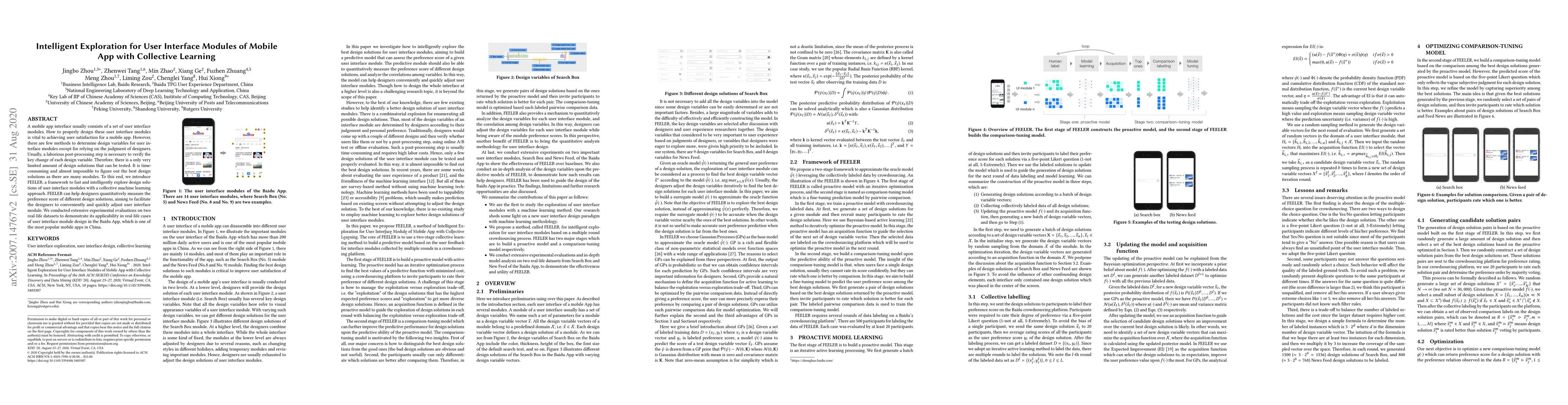 A mobile app interface usually consists of a set of user interface modules. How to properly design these user interface modules is vital to achieving user satisfaction for a mobile app. However, there are few methods to determine design variables for user interface modules except for relying on the judgment of designers. Usually, a laborious post-processing step is necessary to verify the key change of each design variable. Therefore, there is a only very limited amount of design solutions that can be tested. It is timeconsuming and almost impossible to figure out the best design solutions as there are many modules. To this end, we introduce FEELER, a framework to fast and intelligently explore design solutions of user interface modules with a collective machine learning approach. FEELER can help designers quantitatively measure the preference score of different design solutions, aiming to facilitate the designers to conveniently and quickly adjust user interface module. We conducted extensive experimental evaluations on two real-life datasets to demonstrate its applicability in real-life cases of user interface module design in the Baidu App, which is one of the most popular mobile apps in China.