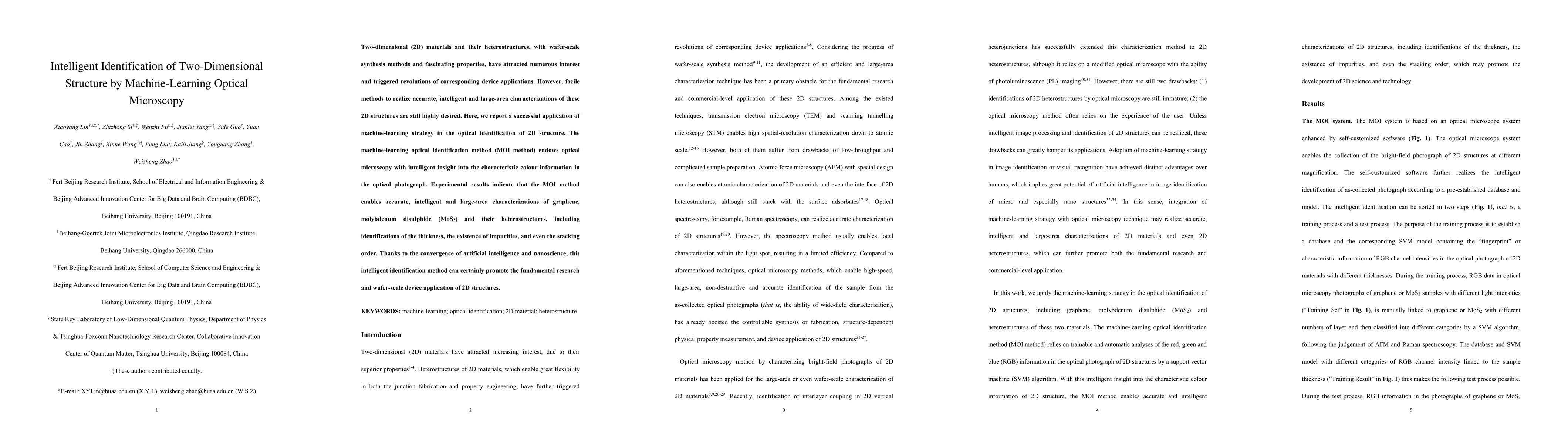 This paper presents a machine-learning optical microscopy method (MOI method) for intelligent identification of two-dimensional materials like graphene and MoS2, enabling accurate characterization of thickness, impurities, and stacking order over large areas. This advancement facilitates fundamental research and device applications in 2D material technology.