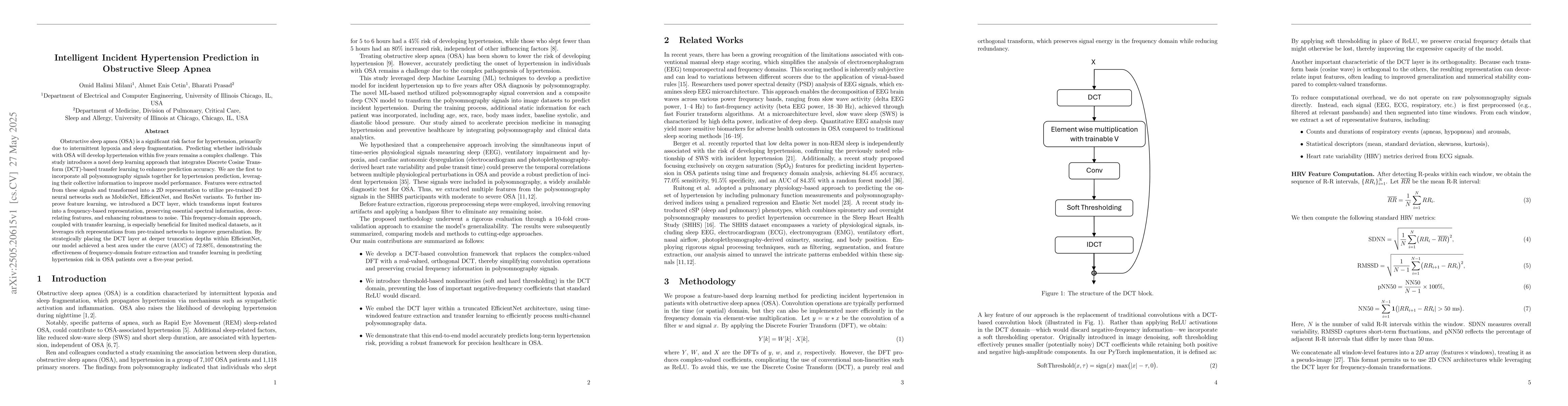 The study employs a deep learning approach integrating Discrete Cosine Transform (DCT)-based transfer learning for predicting incident hypertension in Obstructive Sleep Apnea (OSA) patients. It combines all polysomnography signals, extracts features, and transforms them into a 2D representation to utilize pre-trained 2D neural networks like MobileNet, EfficientNet, and ResNet variants. A DCT layer is introduced to enhance feature learning by transforming input features into a frequency-based representation, preserving essential spectral information and improving robustness to noise.
