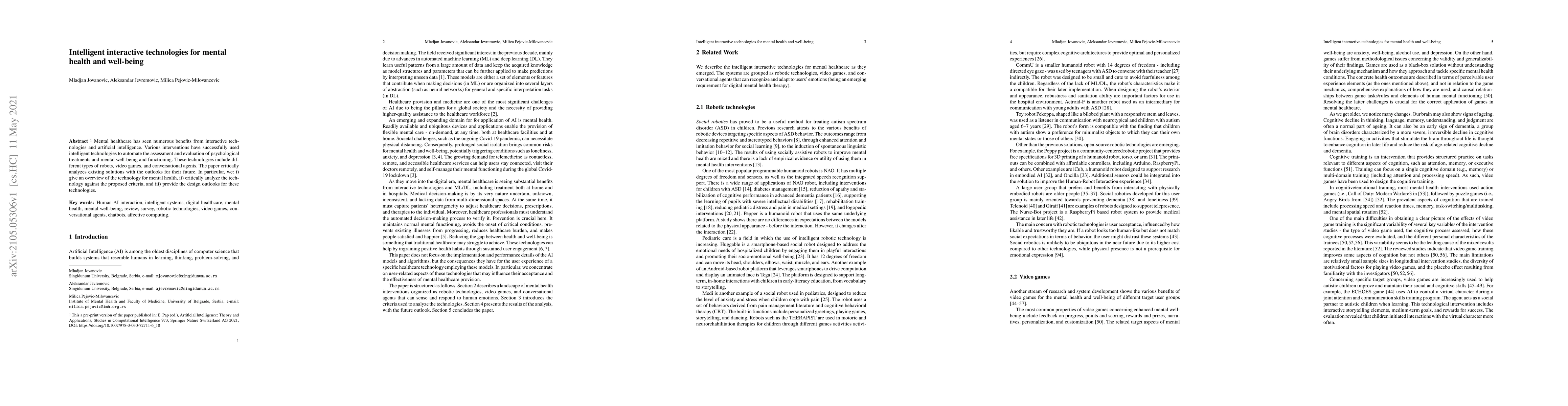 This paper reviews intelligent interactive technologies, including robots, video games, and conversational agents, for mental health assessment and treatment, critically analyzing their effectiveness and proposing future design directions. The study provides an overview of current technologies and evaluates them against specific criteria.