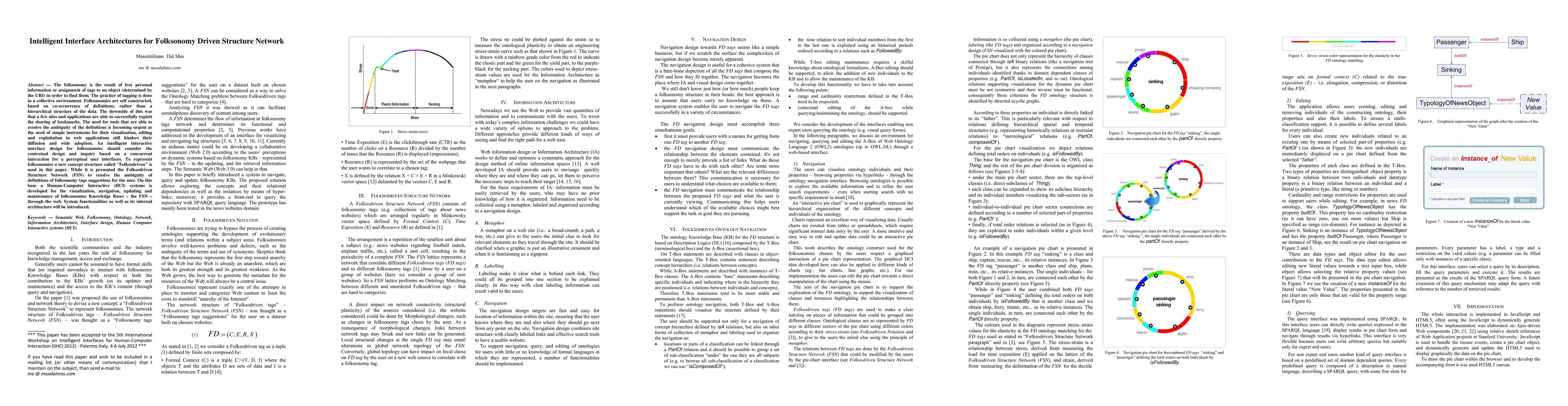 The folksonomy is the result of free personal information or assignment of tags to an object (determined by the URI) in order to find them. The practice of tagging is done in a collective environment. Folksonomies are self constructed, based on co-occurrence of definitions, rather than a hierarchical structure of the data. The downside of this was that a few sites and applications are able to successfully exploit the sharing of bookmarks. The need for tools that are able to resolve the ambiguity of the definitions is becoming urgent as the need of simple instruments for their visualization, editing and exploitation in web applications still hinders their diffusion and wide adoption. An intelligent interactive interface design for folksonomies should consider the contextual design and inquiry based on a concurrent interaction for a perceptual user interfaces. To represent folksonomies a new concept structure called "Folksodriven" is used in this paper. While it is presented the Folksodriven Structure Network (FSN) to resolve the ambiguity of definitions of folksonomy tags suggestions for the user. On this base a Human-Computer Interactive (HCI) systems is developed for the visualization, navigation, updating and maintenance of folksonomies Knowledge Bases - the FSN - through the web. System functionalities as well as its internal architecture will be introduced.