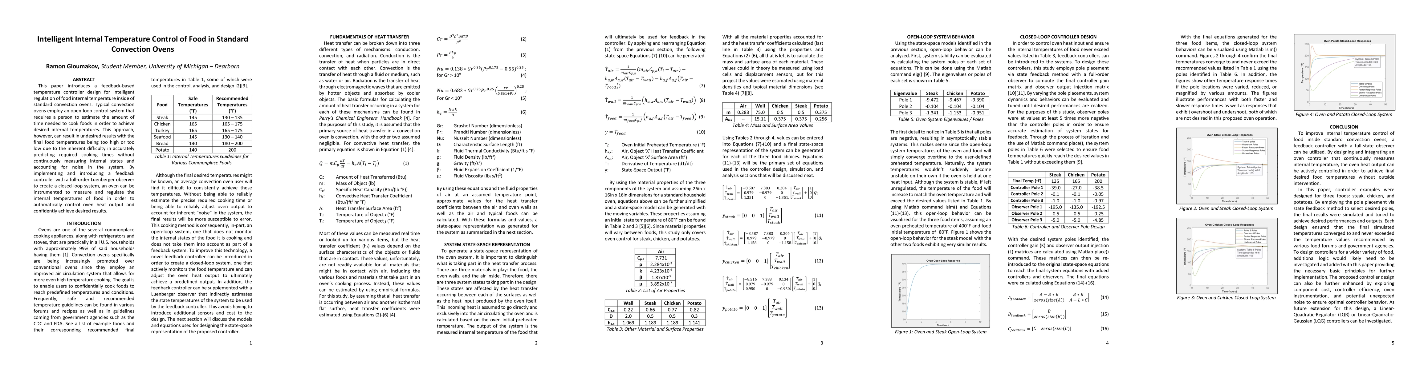 This paper introduces a feedback-based temperature controller design for intelligent regulation of food internal temperature inside of standard convection ovens. Typical convection ovens employ an open-loop control system that requires a person to estimate the amount of time needed to cook foods in order to achieve desired internal temperatures. This approach, however, can result in undesired results with the final food temperatures being too high or too low due to the inherent difficulty in accurately predicting required cooking times without continuously measuring internal states and accounting for noise in the system. By implementing and introducing a feedback controller with a full-order Luenberger observer to create a closed-loop system, an oven can be instrumented to measure and regulate the internal temperatures of food in order to automatically control oven heat output and confidently achieve desired results.