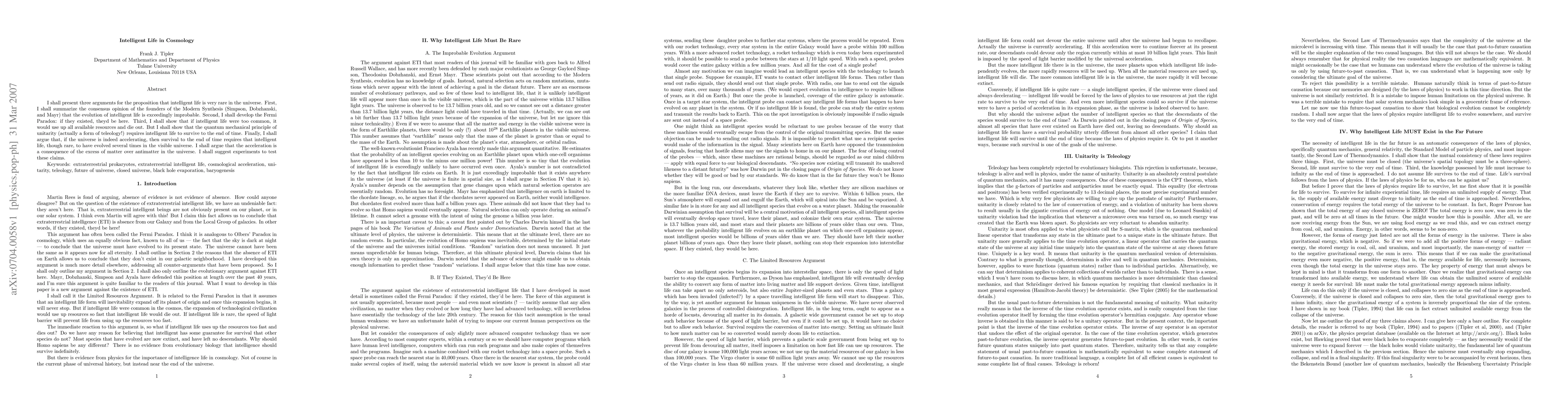 I shall present three arguments for the proposition that intelligent life is very rare in the universe. First, I shall summarize the consensus opinion of the founders of the Modern Synthesis (Simpson, Dobzhanski, and Mayr) that the evolution of intelligent life is exceedingly improbable. Second, I shall develop the Fermi Paradox: if they existed they'd be here. Third, I shall show that if intelligent life were too common, it would use up all available resources and die out. But I shall show that the quantum mechanical principle of unitarity (actually a form of teleology!) requires intelligent life to survive to the end of time. Finally, I shall argue that, if the universe is indeed accelerating, then survival to the end of time requires that intelligent life, though rare, to have evolved several times in the visible universe. I shall argue that the acceleration is a consequence of the excess of matter over antimatter in the universe. I shall suggest experiments to test these claims.