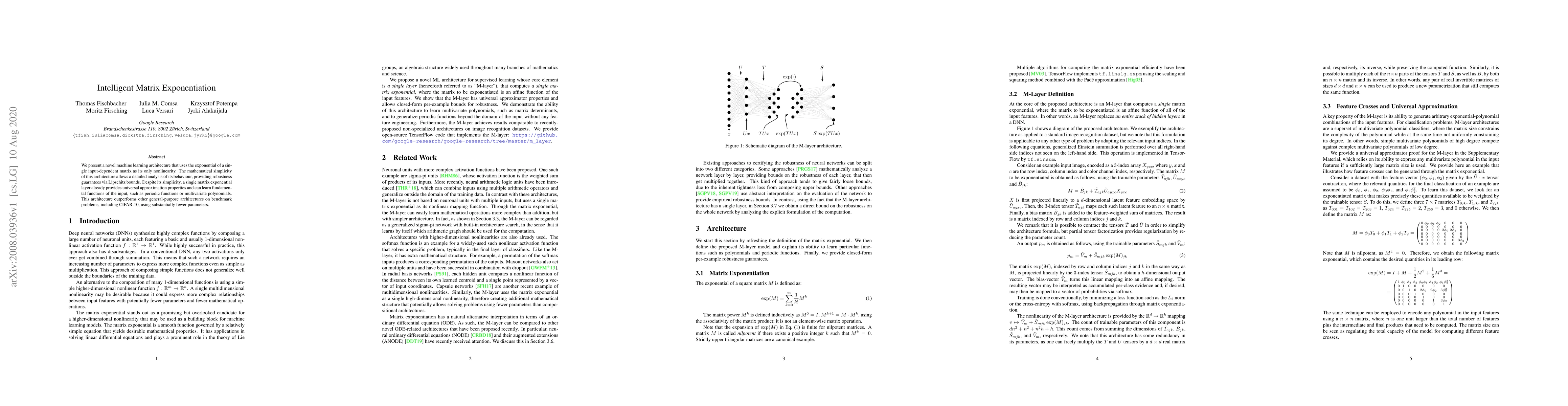 We present a novel machine learning architecture that uses the exponential of a single input-dependent matrix as its only nonlinearity. The mathematical simplicity of this architecture allows a detailed analysis of its behaviour, providing robustness guarantees via Lipschitz bounds. Despite its simplicity, a single matrix exponential layer already provides universal approximation properties and can learn fundamental functions of the input, such as periodic functions or multivariate polynomials. This architecture outperforms other general-purpose architectures on benchmark problems, including CIFAR-10, using substantially fewer parameters.