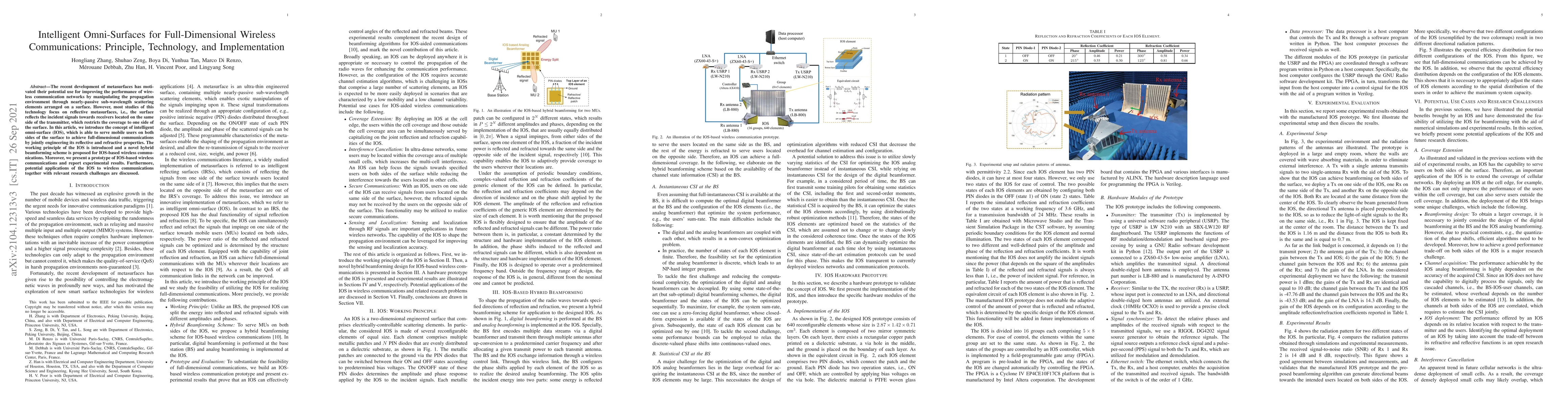 This paper introduces the concept of intelligent omni-surfaces (IOS) to enable full-dimensional wireless communication by manipulating both reflective and refractive properties. A novel hybrid beamforming scheme is proposed, and experimental results demonstrate its potential applications and challenges in wireless communications.