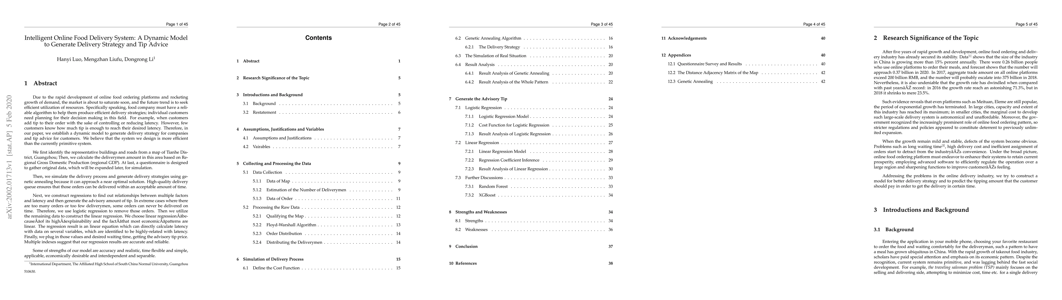 This paper proposes a dynamic model for an intelligent online food delivery system that generates efficient delivery strategies for companies and tip advice for customers to control delivery latency. The model uses genetic annealing for optimal delivery strategy and regression analysis to determine the optimal tip amount based on various factors.