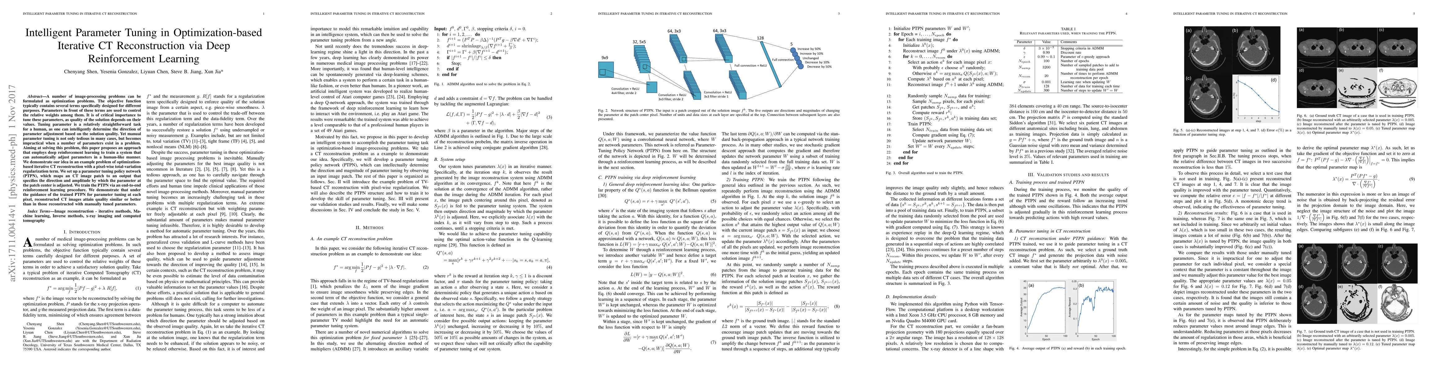 A number of image-processing problems can be formulated as optimization problems. The objective function typically contains several terms specifically designed for different purposes. Parameters in front of these terms are used to control the relative weights among them. It is of critical importance to tune these parameters, as quality of the solution depends on their values. Tuning parameter is a relatively straightforward task for a human, as one can intelligently determine the direction of parameter adjustment based on the solution quality. Yet manual parameter tuning is not only tedious in many cases, but becomes impractical when a number of parameters exist in a problem. Aiming at solving this problem, this paper proposes an approach that employs deep reinforcement learning to train a system that can automatically adjust parameters in a human-like manner. We demonstrate our idea in an example problem of optimization-based iterative CT reconstruction with a pixel-wise total-variation regularization term. We set up a parameter tuning policy network (PTPN), which maps an CT image patch to an output that specifies the direction and amplitude by which the parameter at the patch center is adjusted. We train the PTPN via an end-to-end reinforcement learning procedure. We demonstrate that under the guidance of the trained PTPN for parameter tuning at each pixel, reconstructed CT images attain quality similar or better than in those reconstructed with manually tuned parameters.