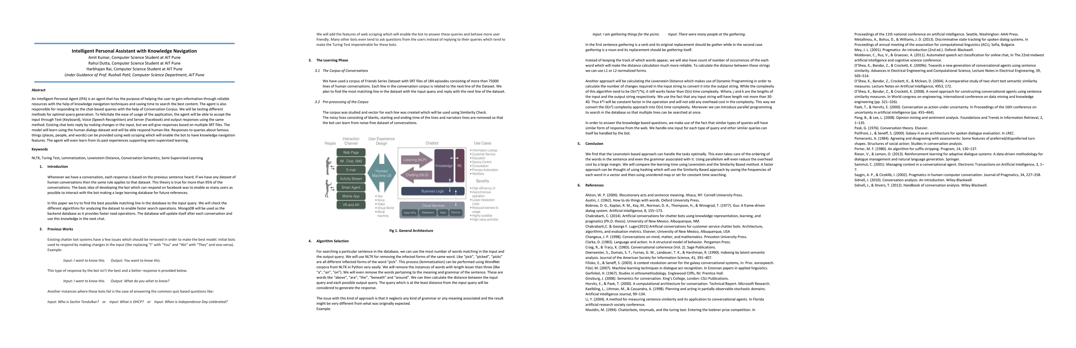 An Intelligent Personal Agent (IPA) is an agent that has the purpose of helping the user to gain information through reliable resources with the help of knowledge navigation techniques and saving time to search the best content. The agent is also responsible for responding to the chat-based queries with the help of Conversation Corpus. We will be testing different methods for optimal query generation. To felicitate the ease of usage of the application, the agent will be able to accept the input through Text (Keyboard), Voice (Speech Recognition) and Server (Facebook) and output responses using the same method. Existing chat bots reply by making changes in the input, but we will give responses based on multiple SRT files. The model will learn using the human dialogs dataset and will be able respond human-like. Responses to queries about famous things (places, people, and words) can be provided using web scraping which will enable the bot to have knowledge navigation features. The agent will even learn from its past experiences supporting semi-supervised learning.
