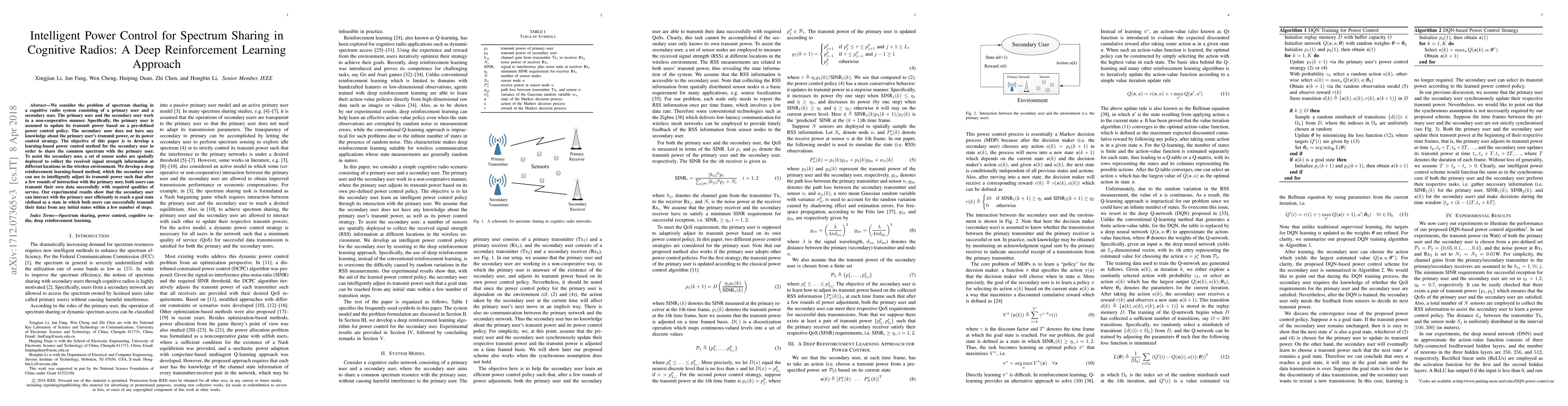 A deep reinforcement learning approach is proposed to enable secondary users in cognitive radios to intelligently adjust their transmit power to share spectrum with primary users, achieving successful data transmission within a few steps.