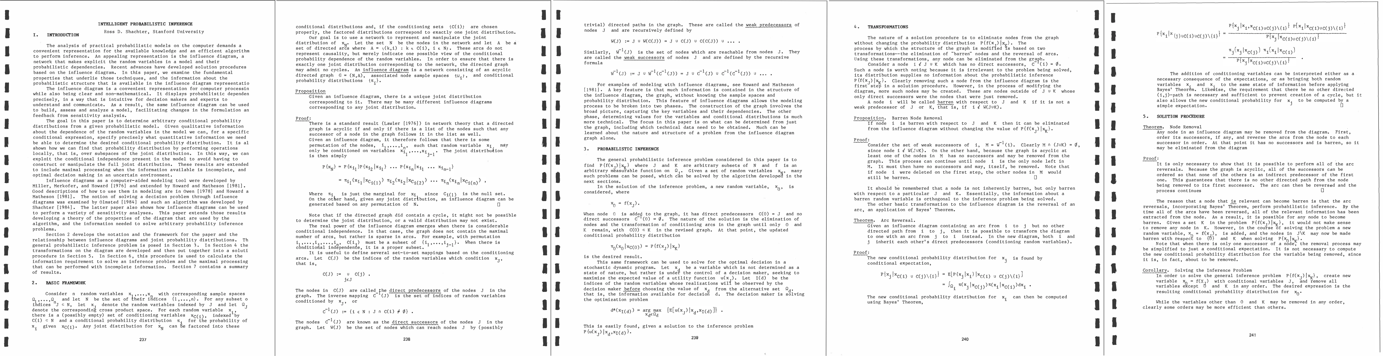 The analysis of practical probabilistic models on the computer demands a convenient representation for the available knowledge and an efficient algorithm to perform inference. An appealing representation is the influence diagram, a network that makes explicit the random variables in a model and their probabilistic dependencies. Recent advances have developed solution procedures based on the influence diagram. In this paper, we examine the fundamental properties that underlie those techniques, and the information about the probabilistic structure that is available in the influence diagram representation. The influence diagram is a convenient representation for computer processing while also being clear and non-mathematical. It displays probabilistic dependence precisely, in a way that is intuitive for decision makers and experts to understand and communicate. As a result, the same influence diagram can be used to build, assess and analyze a model, facilitating changes in the formulation and feedback from sensitivity analysis. The goal in this paper is to determine arbitrary conditional probability distributions from a given probabilistic model. Given qualitative information about the dependence of the random variables in the model we can, for a specific conditional expression, specify precisely what quantitative information we need to be able to determine the desired conditional probability distribution. It is also shown how we can find that probability distribution by performing operations locally, that is, over subspaces of the joint distribution. In this way, we can exploit the conditional independence present in the model to avoid having to construct or manipulate the full joint distribution. These results are extended to include maximal processing when the information available is incomplete, and optimal decision making in an uncertain environment. Influence diagrams as a computer-aided modeling tool were developed by Miller, Merkofer, and Howard [5] and extended by Howard and Matheson [2]. Good descriptions of how to use them in modeling are in Owen [7] and Howard and Matheson [2]. The notion of solving a decision problem through influence diagrams was examined by Olmsted [6] and such an algorithm was developed by Shachter [8]. The latter paper also shows how influence diagrams can be used to perform a variety of sensitivity analyses. This paper extends those results by developing a theory of the properties of the diagram that are used by the algorithm, and the information needed to solve arbitrary probability inference problems. Section 2 develops the notation and the framework for the paper and the relationship between influence diagrams and joint probability distributions. The general probabilistic inference problem is posed in Section 3. In Section 4 the transformations on the diagram are developed and then put together into a solution procedure in Section 5. In Section 6, this procedure is used to calculate the information requirement to solve an inference problem and the maximal processing that can be performed with incomplete information. Section 7 contains a summary of results.
