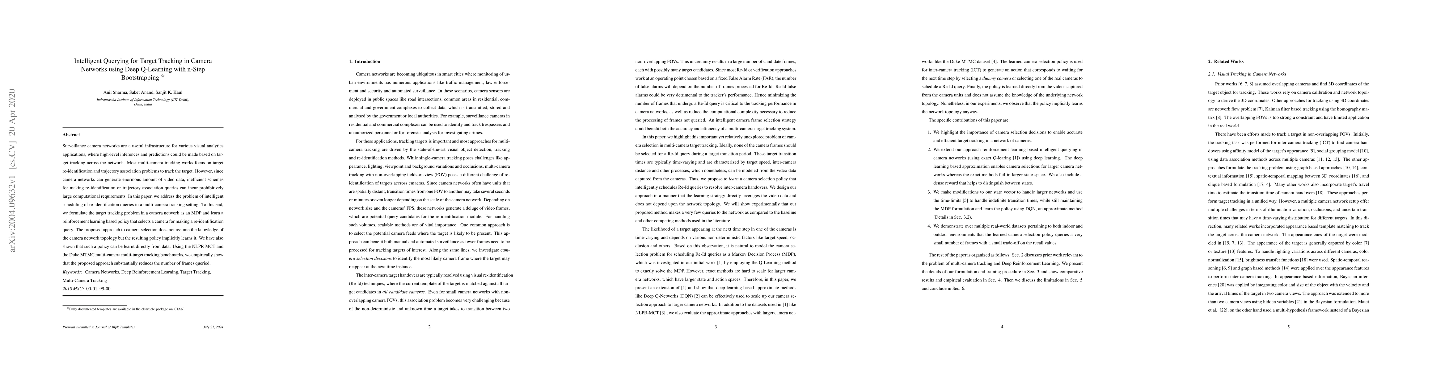 This paper proposes a deep Q-learning method with n-step bootstrapping to intelligently schedule re-identification queries in camera networks for target tracking, significantly reducing computational load by learning a policy that selects optimal cameras without prior knowledge of network topology. Empirical results on benchmark datasets show a substantial reduction in queried frames.