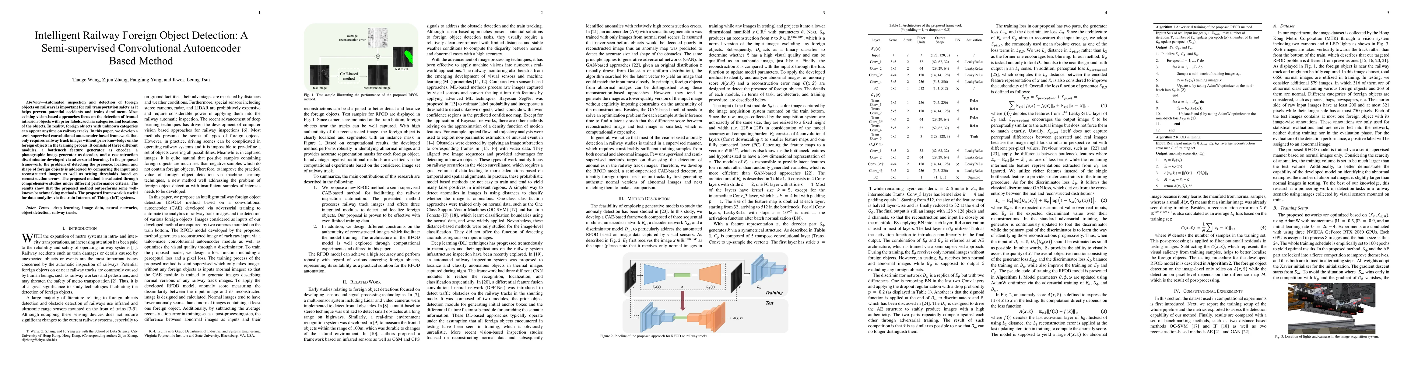 Automated inspection and detection of foreign objects on railways is important for rail transportation safety as it helps prevent potential accidents and trains derailment. Most existing vision-based approaches focus on the detection of frontal intrusion objects with prior labels, such as categories and locations of the objects. In reality, foreign objects with unknown categories can appear anytime on railway tracks. In this paper, we develop a semi-supervised convolutional autoencoder based framework that only requires railway track images without prior knowledge on the foreign objects in the training process. It consists of three different modules, a bottleneck feature generator as encoder, a photographic image generator as decoder, and a reconstruction discriminator developed via adversarial learning. In the proposed framework, the problem of detecting the presence, location, and shape of foreign objects is addressed by comparing the input and reconstructed images as well as setting thresholds based on reconstruction errors. The proposed method is evaluated through comprehensive studies under different performance criteria. The results show that the proposed method outperforms some well-known benchmarking methods. The proposed framework is useful for data analytics via the train Internet-of-Things (IoT) systems