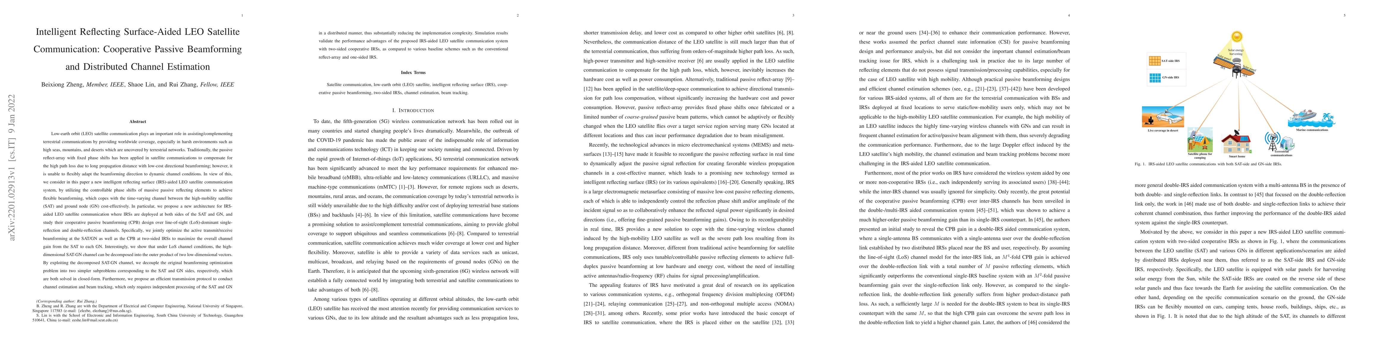 The work is novel in its application of IRSs for LEO satellite communication, decomposing the high-dimensional channel into low-dimensional vectors for simplified beamforming optimization and introducing a distributed channel estimation protocol for high-mobility scenarios.