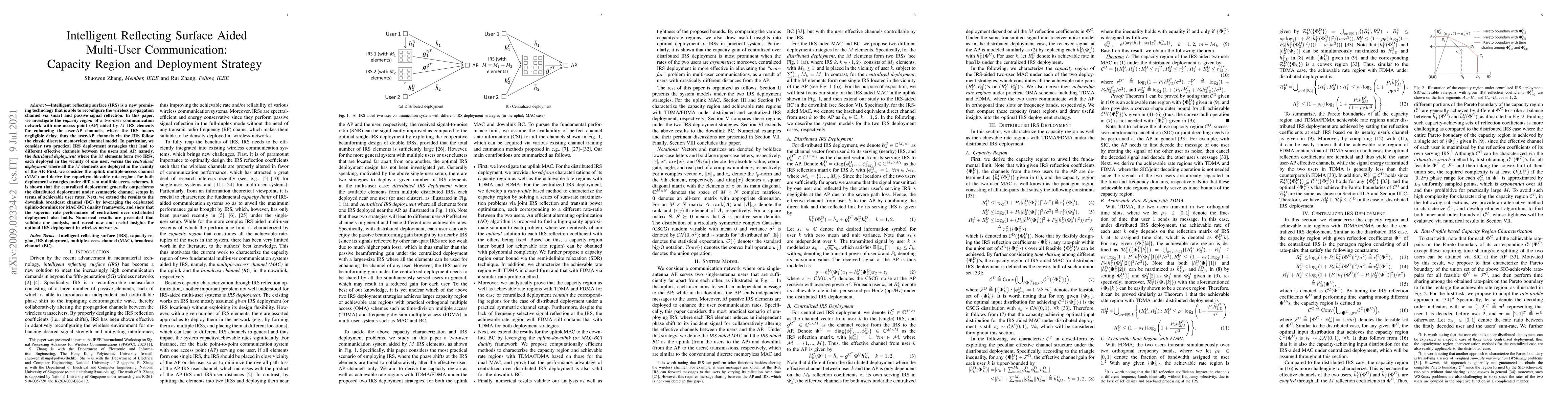 Intelligent reflecting surface (IRS) is a new promising technology that is able to reconfigure the wireless propagation channel via smart and passive signal reflection. In this paper, we investigate the capacity region of a two-user communication network with one access point (AP) aided by $M$ IRS elements for enhancing the user-AP channels, where the IRS incurs negligible delay, thus the user-AP channels via the IRS follow the classic discrete memoryless channel model. In particular, we consider two practical IRS deployment strategies that lead to different effective channels between the users and AP, namely, the distributed deployment where the $M$ elements form two IRSs, each deployed in the vicinity of one user, versus the centralized deployment where all the $M$ elements are deployed in the vicinity of the AP. First, we consider the uplink multiple-access channel (MAC) and derive the capacity/achievable rate regions for both deployment strategies under different multiple access schemes. It is shown that the centralized deployment generally outperforms the distributed deployment under symmetric channel setups in terms of achievable user rates. Next, we extend the results to the downlink broadcast channel (BC) by leveraging the celebrated uplink-downlink (or MAC-BC) duality framework, and show that the superior rate performance of centralized over distributed deployment also holds. Numerical results are presented that validate our analysis, and reveal new and useful insights for optimal IRS deployment in wireless networks.