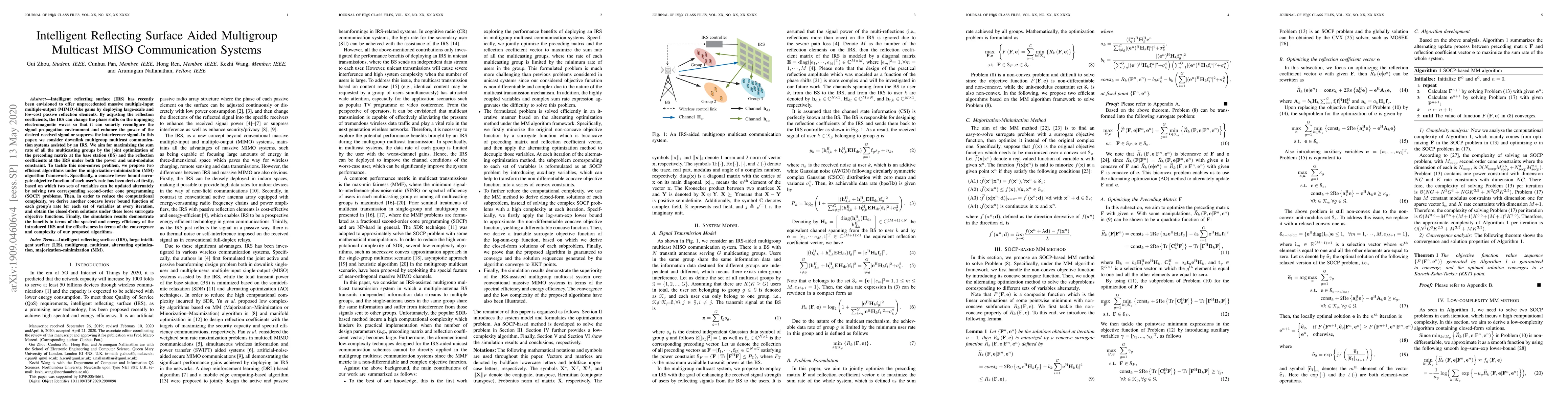 This paper explores the use of intelligent reflecting surfaces (IRS) to enhance multigroup multicast communication systems in MISO setups. The authors propose algorithms to optimize the precoding matrix and IRS reflection coefficients to maximize the sum rate under power and unit-modulus constraints, demonstrating improved spectral and energy efficiency through simulations.