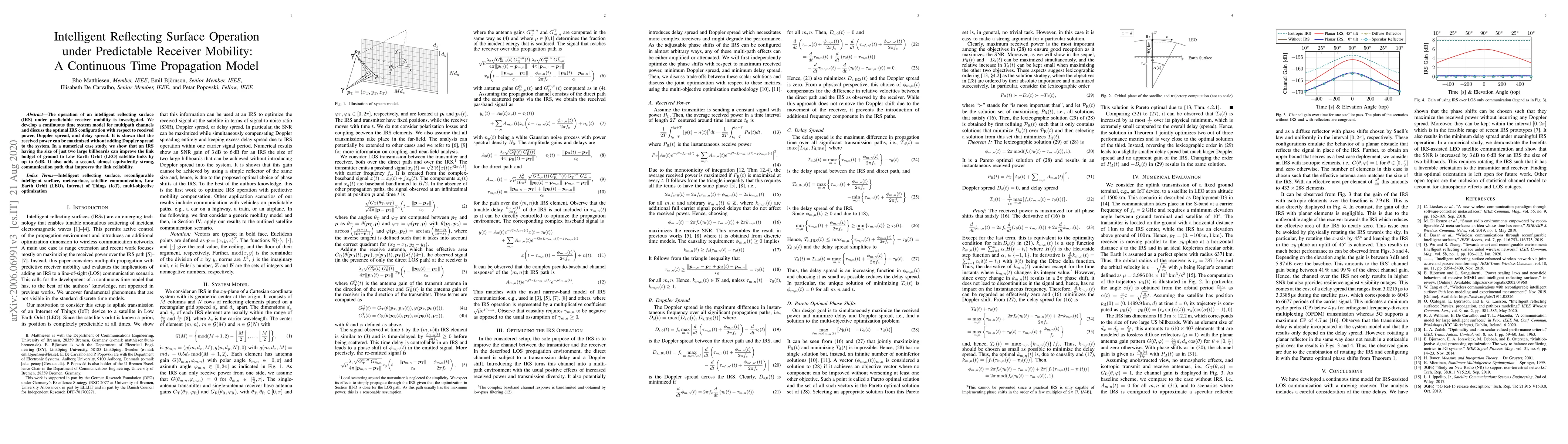 The operation of an intelligent reflecting surface (IRS) under predictable receiver mobility is investigated. We develop a continuous time system model for multipath channels and discuss the optimal IRS configuration with respect to received power, Doppler spread, and delay spread. It is shown that the received power can be maximized without adding Doppler spread to the system. In a numerical case study, we show that an IRS having the size of just two large billboards can improve the link budget of ground to Low Earth Orbit (LEO) satellite links by up to 6 dB. It also adds a second, almost equivalently strong, communication path that improves the link reliability.