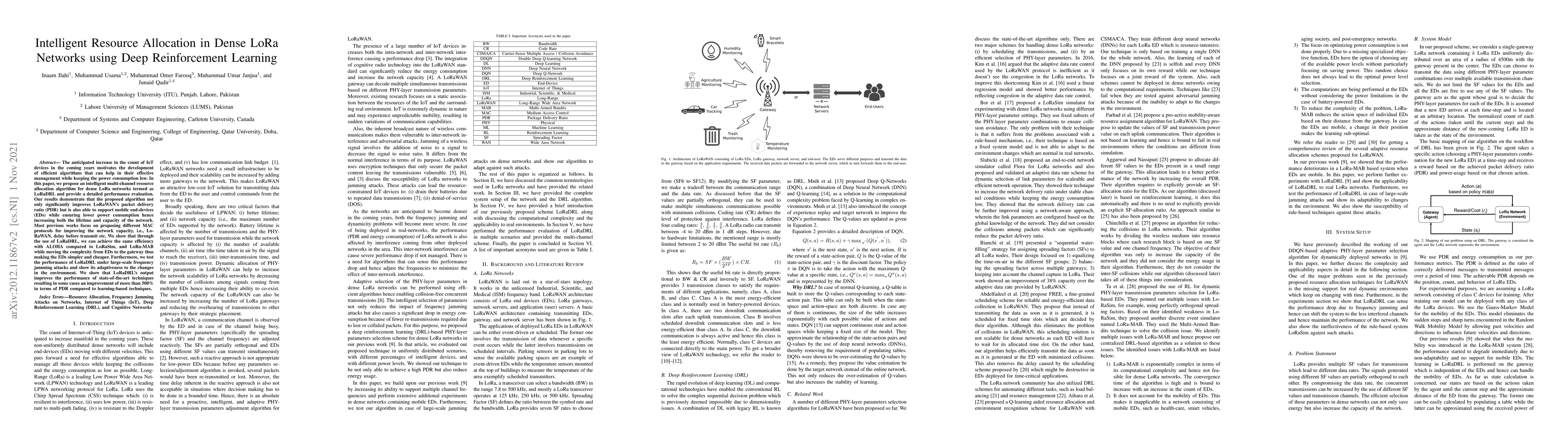 This paper proposes a deep reinforcement learning algorithm to optimize resource allocation in dense LoRa networks, achieving significant improvements in packet delivery ratio and supporting mobile devices while reducing power consumption.