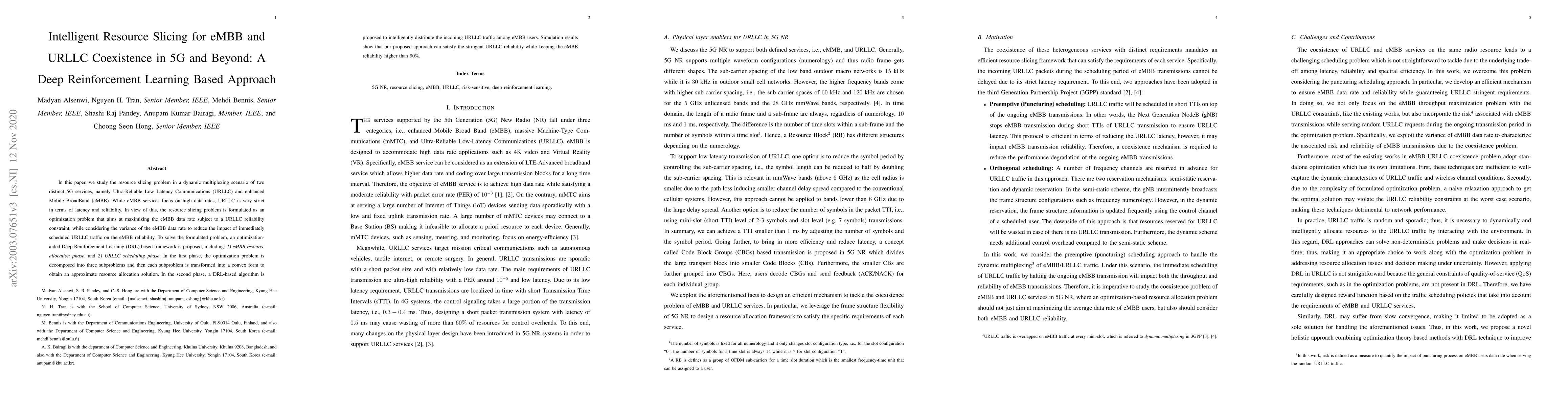 This paper proposes a Deep Reinforcement Learning (DRL) based framework to optimize resource slicing for coexisting Ultra-Reliable Low Latency Communications (URLLC) and enhanced Mobile BroadBand (eMBB) services in 5G networks. The approach maximizes eMBB data rates while maintaining URLLC reliability constraints, achieving high eMBB reliability over 90%.