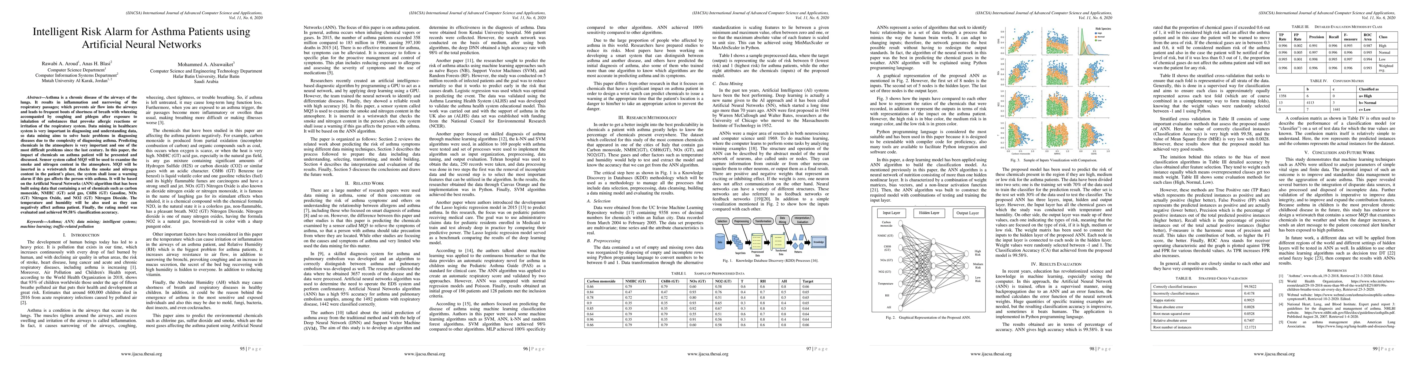 This paper proposes an intelligent risk alarm system for asthma patients using an Artificial Neural Network (ANN) algorithm to predict the impact of atmospheric pollutants. The system, equipped with a MQ5 sensor in a wristwatch, monitors smoke and nitrogen levels, and issues alarms based on the ANN model trained with data on various chemicals and environmental factors, achieving 99.58% classification accuracy.