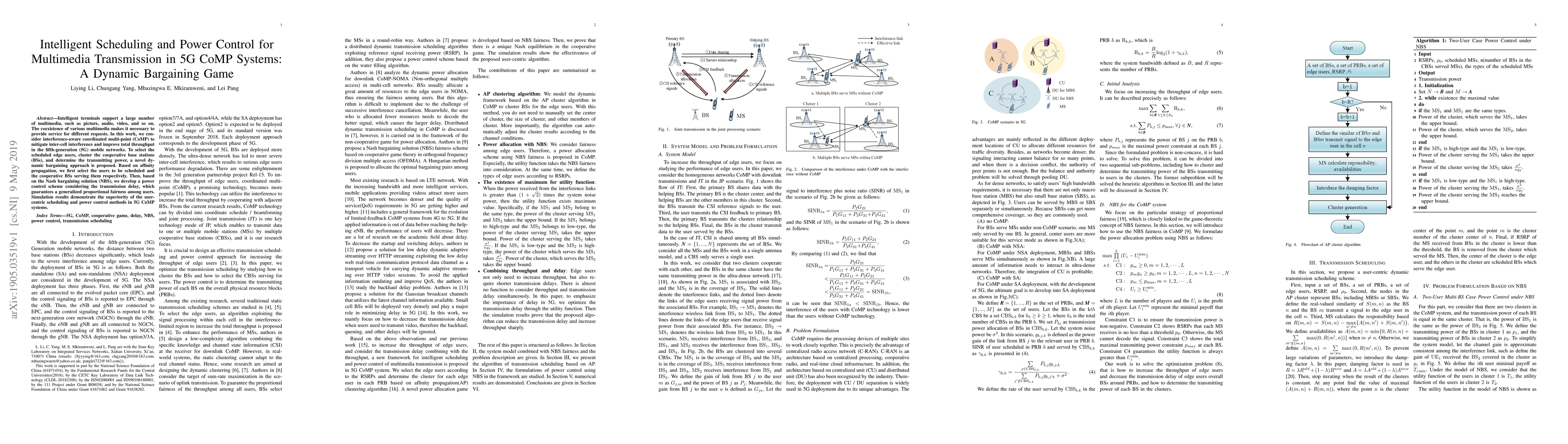 This paper proposes a dynamic bargaining game approach for intelligent scheduling and power control in 5G CoMP systems to mitigate inter-cell interference and enhance throughput. It uses affinity propagation for user selection and cooperative base station clustering, followed by a Nash bargaining solution-based power control scheme to ensure fair transmission. Simulation results show improved performance over traditional methods.