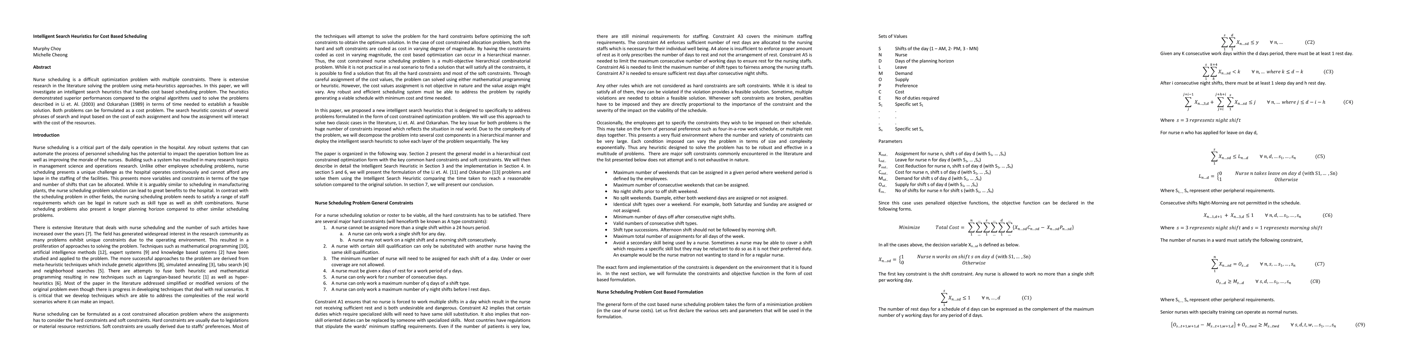 This paper proposes an intelligent search heuristic for cost-based nurse scheduling, demonstrating superior performance over existing algorithms by efficiently establishing feasible solutions faster. The heuristics involve multiple search phases, optimizing resource costs through assignment interactions.