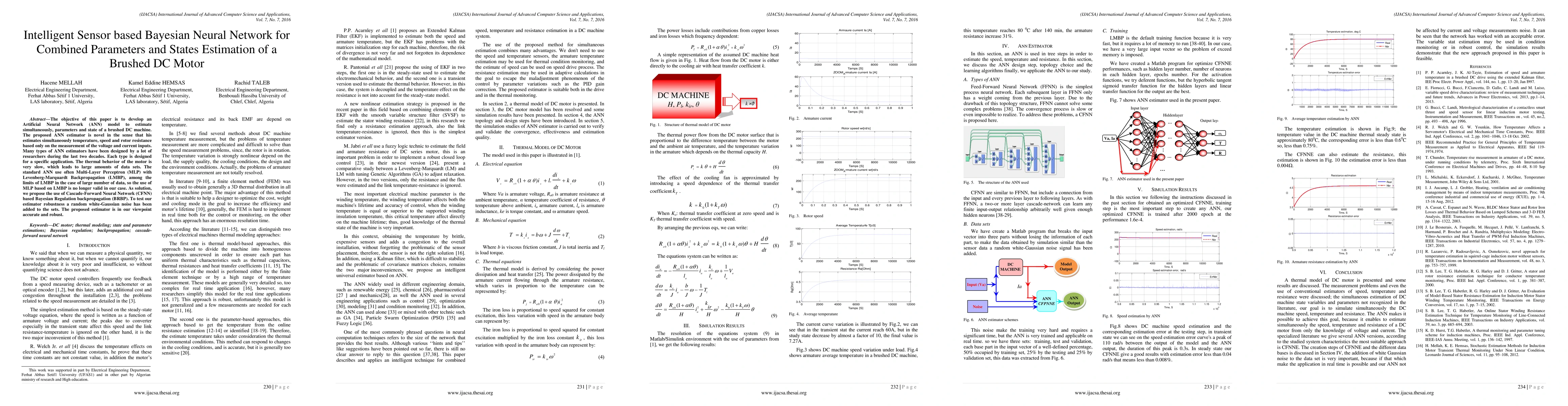 This paper proposes a Cascade-Forward Neural Network (CFNN) based on Bayesian Regulation backpropagation (BRBP) to simultaneously estimate parameters and states of a brushed DC motor, including temperature, speed, and rotor resistance, using only voltage and current inputs. The proposed method is shown to be robust and accurate even with added random noise.