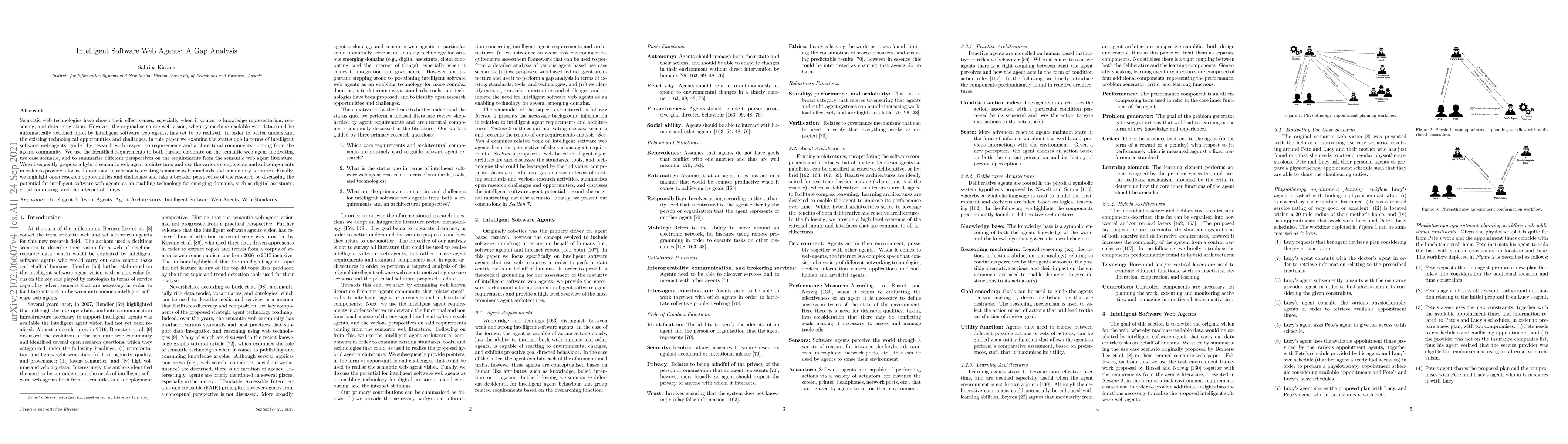 Semantic web technologies have shown their effectiveness, especially when it comes to knowledge representation, reasoning, and data integration. However, the original semantic web vision, whereby machine readable web data could be automatically actioned upon by intelligent software web agents, has yet to be realised. In order to better understand the existing technological opportunities and challenges, in this paper we examine the status quo in terms of intelligent software web agents, guided by research with respect to requirements and architectural components, coming from the agents community. We use the identified requirements to both further elaborate on the semantic web agent motivating use case scenario, and to summarise different perspectives on the requirements from the semantic web agent literature. We subsequently propose a hybrid semantic web agent architecture, and use the various components and subcomponents in order to provide a focused discussion in relation to existing semantic web standards and community activities. Finally, we highlight open research opportunities and challenges and take a broader perspective of the research by discussing the potential for intelligent software web agents as an enabling technology for emerging domains, such as digital assistants, cloud computing, and the internet of things.