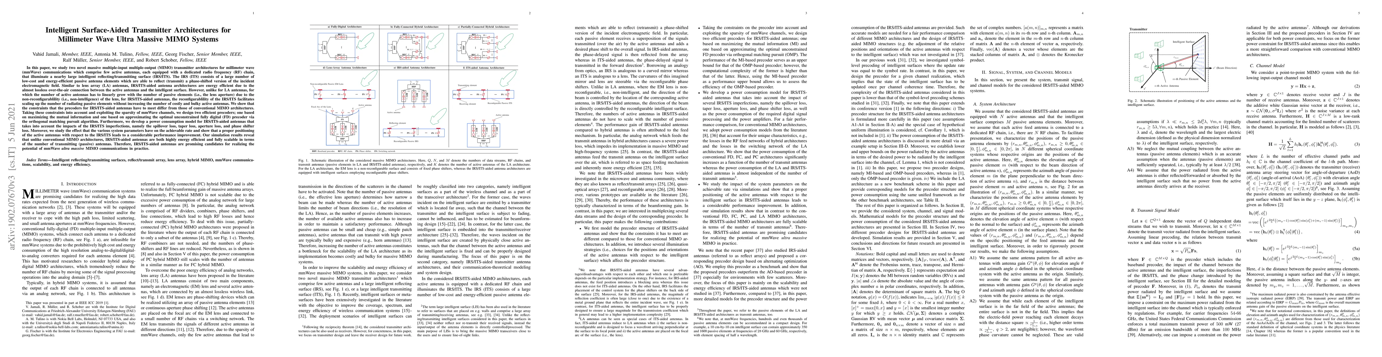 In this paper, we study two novel massive multiple-input multiple-output (MIMO) transmitter architectures for millimeter wave (mmWave) communications which comprise few active antennas, each equipped with a dedicated radio frequency (RF) chain, that illuminate a nearby large intelligent reflecting/transmitting surface (IRS/ITS). The IRS (ITS) consists of a large number of low-cost and energy-efficient passive antenna elements which are able to reflect (transmit) a phase-shifted version of the incident electromagnetic field. Similar to lens array (LA) antennas, IRS/ITS-aided antenna architectures are energy efficient due to the almost lossless over-the-air connection between the active antennas and the intelligent surface. However, unlike for LA antennas, for which the number of active antennas has to linearly grow with the number of passive elements (i.e., the lens aperture) due to the non-reconfigurablility (i.e., non-intelligence) of the lens, for IRS/ITS-aided antennas, the reconfigurablility of the IRS/ITS facilitates scaling up the number of radiating passive elements without increasing the number of costly and bulky active antennas. We show that the constraints that the precoders for IRS/ITS-aided antennas have to meet differ from those of conventional MIMO architectures. Taking these constraints into account and exploiting the sparsity of mmWave channels, we design two efficient precoders; one based on maximizing the mutual information and one based on approximating the optimal unconstrained fully digital (FD) precoder via the orthogonal matching pursuit algorithm. Furthermore, we develop a power consumption model for IRS/ITS-aided antennas that takes into account the impacts of the IRS/ITS imperfections, namely the spillover loss, taper loss, aperture loss, and phase shifter loss.