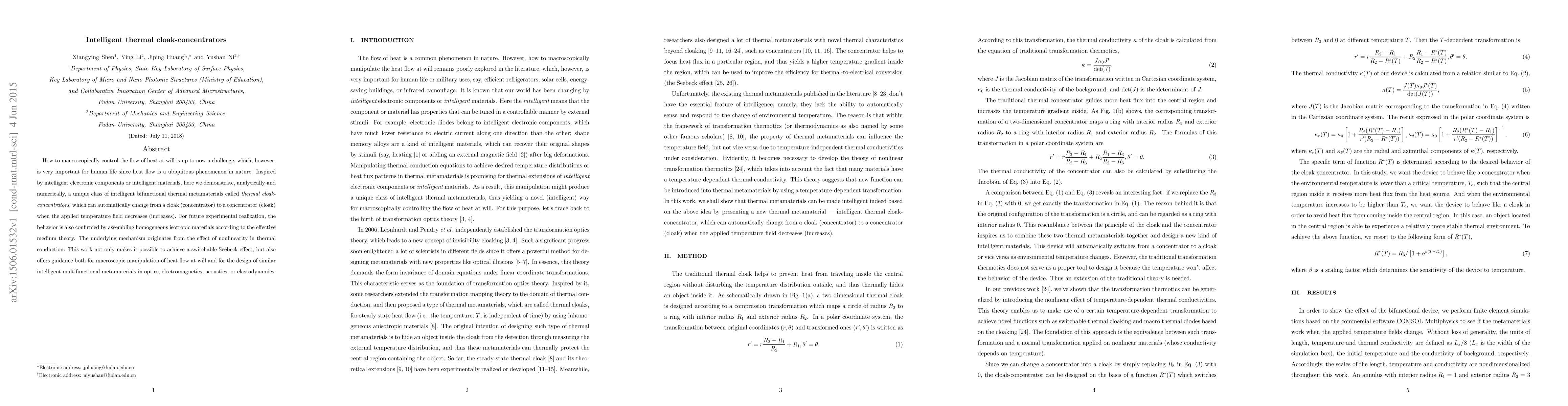 This paper presents intelligent bifunctional thermal metamaterials called thermal cloak-concentrators that can switch between cloaking and concentrating heat based on temperature changes. The study provides both analytical and numerical evidence, and confirms the behavior using effective medium theory with homogeneous isotropic materials.