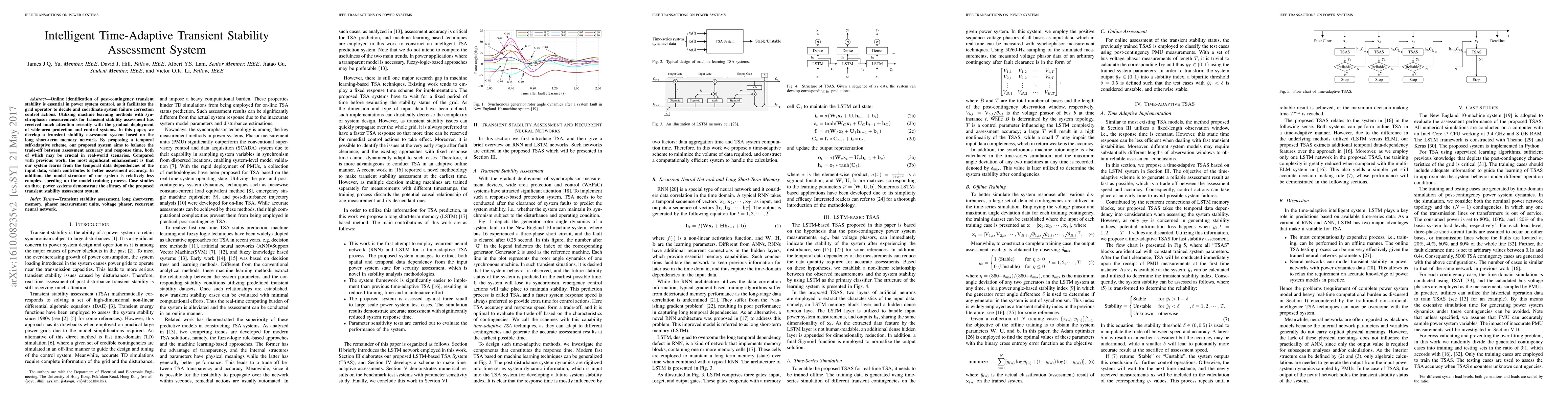 This paper proposes an intelligent time-adaptive transient stability assessment system using a long short-term memory network, which balances accuracy and response time. The system learns temporal data dependencies for better accuracy and has a simpler model structure, speeding up training, as demonstrated by case studies on three power systems.