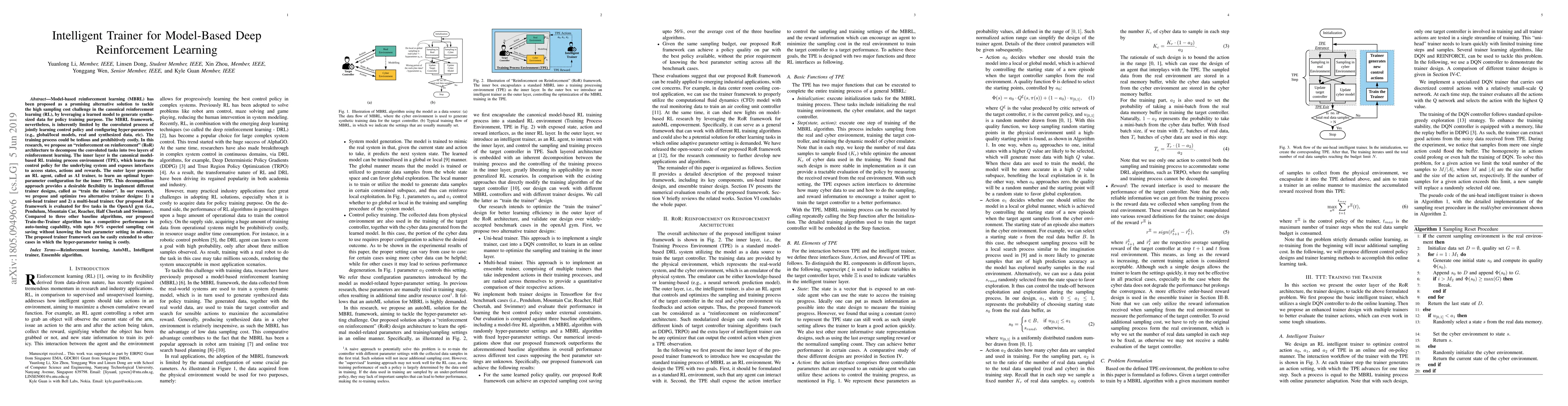 Model-based reinforcement learning (MBRL) has been proposed as a promising alternative solution to tackle the high sampling cost challenge in the canonical reinforcement learning (RL), by leveraging a learned model to generate synthesized data for policy training purpose. The MBRL framework, nevertheless, is inherently limited by the convoluted process of jointly learning control policy and configuring hyper-parameters (e.g., global/local models, real and synthesized data, etc). The training process could be tedious and prohibitively costly. In this research, we propose an "reinforcement on reinforcement" (RoR) architecture to decompose the convoluted tasks into two layers of reinforcement learning. The inner layer is the canonical model-based RL training process environment (TPE), which learns the control policy for the underlying system and exposes interfaces to access states, actions and rewards. The outer layer presents an RL agent, called as AI trainer, to learn an optimal hyper-parameter configuration for the inner TPE. This decomposition approach provides a desirable flexibility to implement different trainer designs, called as "train the trainer". In our research, we propose and optimize two alternative trainer designs: 1) a uni-head trainer and 2) a multi-head trainer. Our proposed RoR framework is evaluated for five tasks in the OpenAI gym (i.e., Pendulum, Mountain Car, Reacher, Half Cheetah and Swimmer). Compared to three other baseline algorithms, our proposed Train-the-Trainer algorithm has a competitive performance in auto-tuning capability, with upto 56% expected sampling cost saving without knowing the best parameter setting in advance. The proposed trainer framework can be easily extended to other cases in which the hyper-parameter tuning is costly.