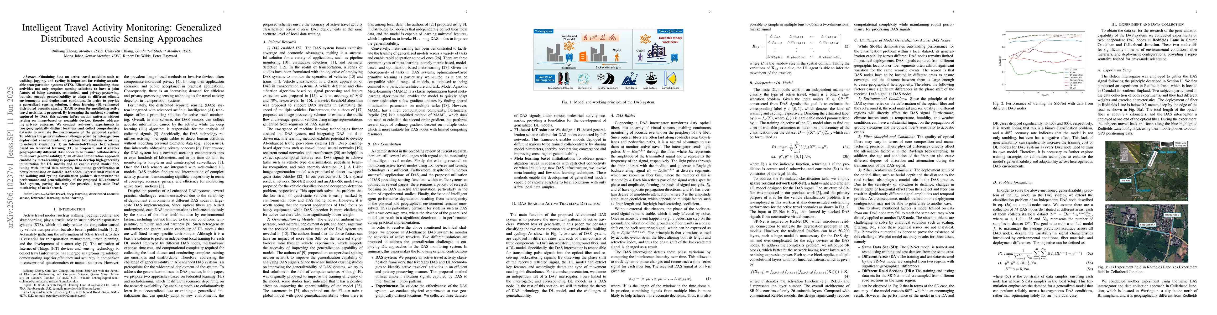 The research proposes a deep learning-enhanced distributed acoustic sensing (DAS) system for monitoring active travel activities like walking and cycling. It addresses privacy concerns by using ambient vibrations and offers two solutions for generalization across diverse environments: an IoT scheme using federated learning for collaborative training of DAS nodes, and an offline initialization approach with meta-learning for rapid model fine-tuning with limited data. Real-world experiments in distinct locations validate the system's performance and generalizability, paving the way for practical, large-scale DAS monitoring of active travel.