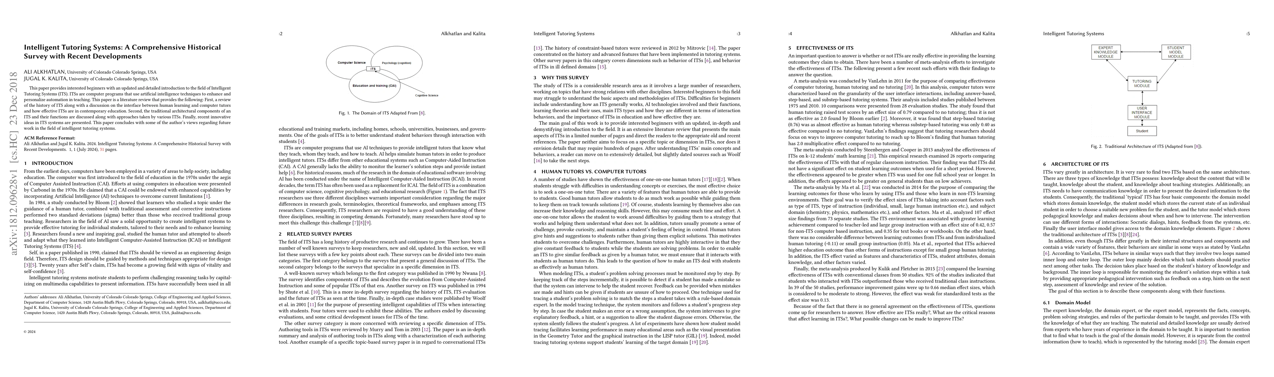 This paper provides interested beginners with an updated and detailed introduction to the field of Intelligent Tutoring Systems (ITS). ITSs are computer programs that use artificial intelligence techniques to enhance and personalize automation in teaching. This paper is a literature review that provides the following: First, a review of the history of ITS along with a discussion on the interface between human learning and computer tutors and how effective ITSs are in contemporary education. Second, the traditional architectural components of an ITS and their functions are discussed along with approaches taken by various ITSs. Finally, recent innovative ideas in ITS systems are presented. This paper concludes with some of the author's views regarding future work in the field of intelligent tutoring systems.