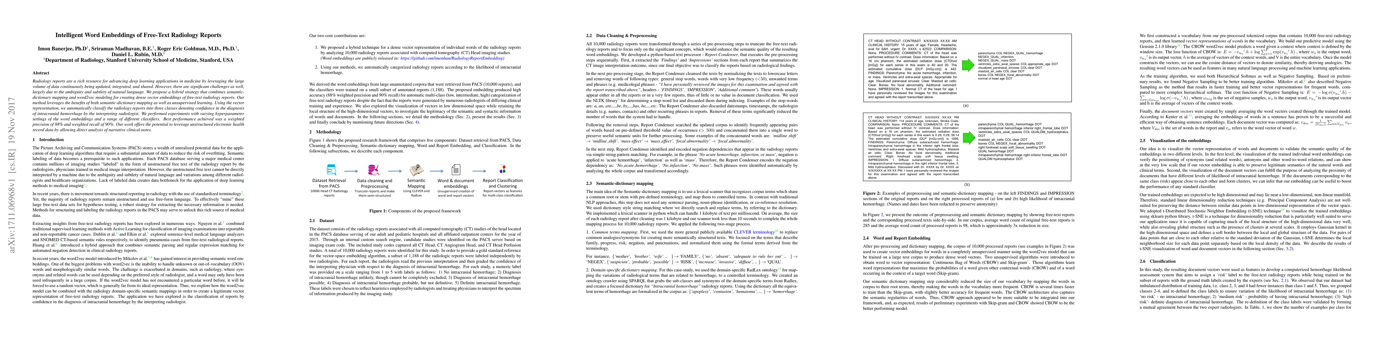 This paper proposes a hybrid method combining semantic-dictionary mapping and word2vec modeling to create dense vector embeddings for free-text radiology reports, achieving high precision and recall in classifying reports related to intracranial hemorrhage. The approach aims to leverage large volumes of radiology data for advanced deep learning applications in medicine.