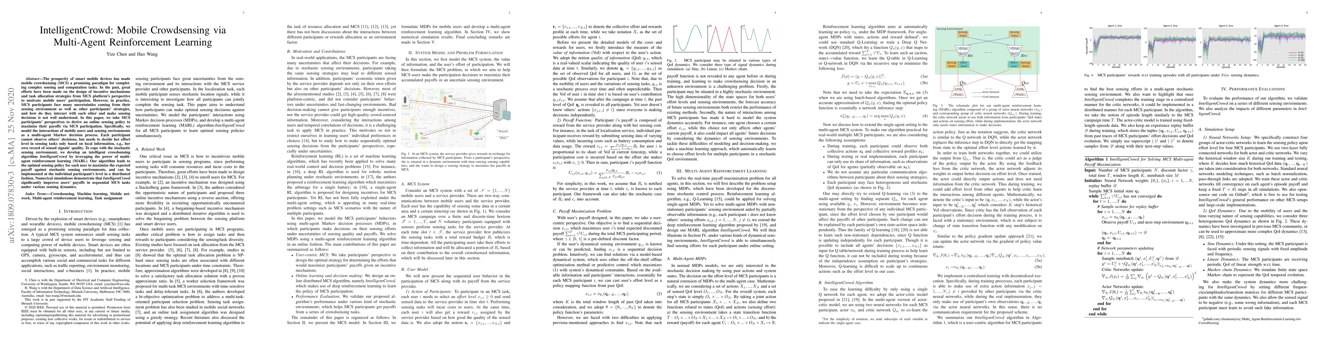 This paper proposes IntelligentCrowd, a multi-agent reinforcement learning algorithm to optimize mobile crowdsensing participants' sensing efforts. It models participants' interactions and stochastic environments as a multi-agent Markov decision process, enabling each user to develop an optimal sensing policy based on local information to maximize their payoffs.