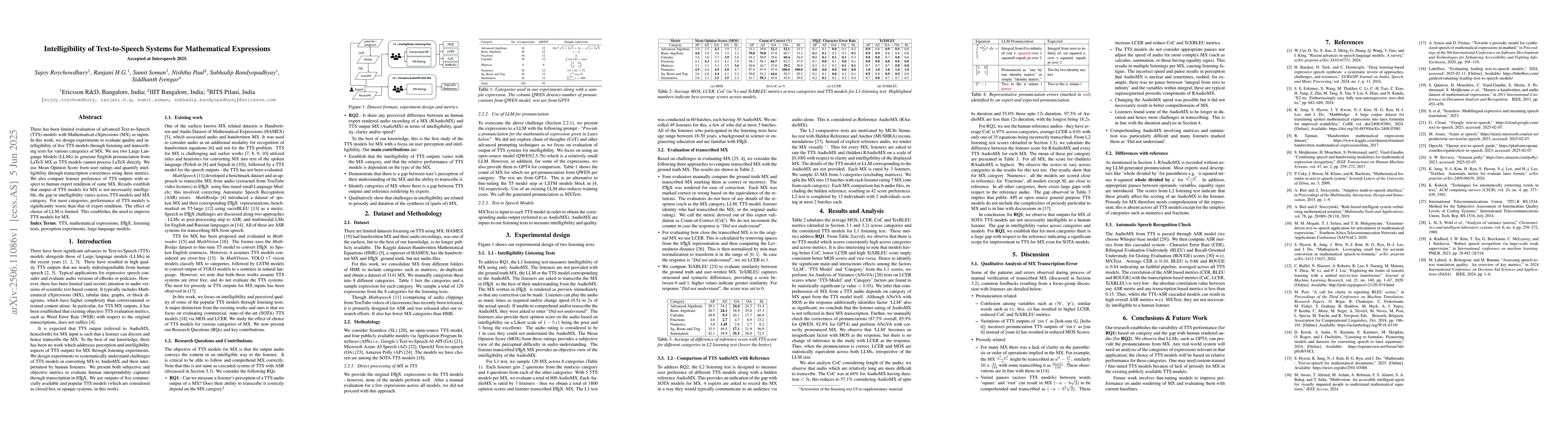 There has been limited evaluation of advanced Text-to-Speech (TTS) models with Mathematical eXpressions (MX) as inputs. In this work, we design experiments to evaluate quality and intelligibility of five TTS models through listening and transcribing tests for various categories of MX. We use two Large Language Models (LLMs) to generate English pronunciation from LaTeX MX as TTS models cannot process LaTeX directly. We use Mean Opinion Score from user ratings and quantify intelligibility through transcription correctness using three metrics. We also compare listener preference of TTS outputs with respect to human expert rendition of same MX. Results establish that output of TTS models for MX is not necessarily intelligible, the gap in intelligibility varies across TTS models and MX category. For most categories, performance of TTS models is significantly worse than that of expert rendition. The effect of choice of LLM is limited. This establishes the need to improve TTS models for MX.