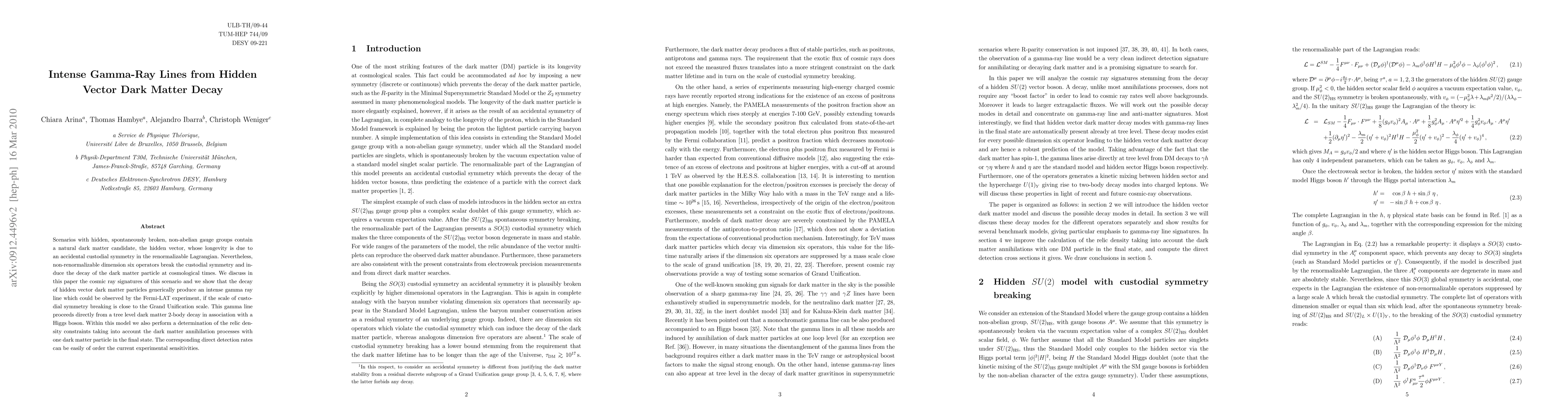 This paper explores the decay of hidden vector dark matter particles in non-abelian gauge theories, predicting an intense gamma-ray line observable by Fermi-LAT if the symmetry breaking scale is near the Grand Unification scale. It also examines the relic density and direct detection rates, showing they could align with current experimental sensitivities.