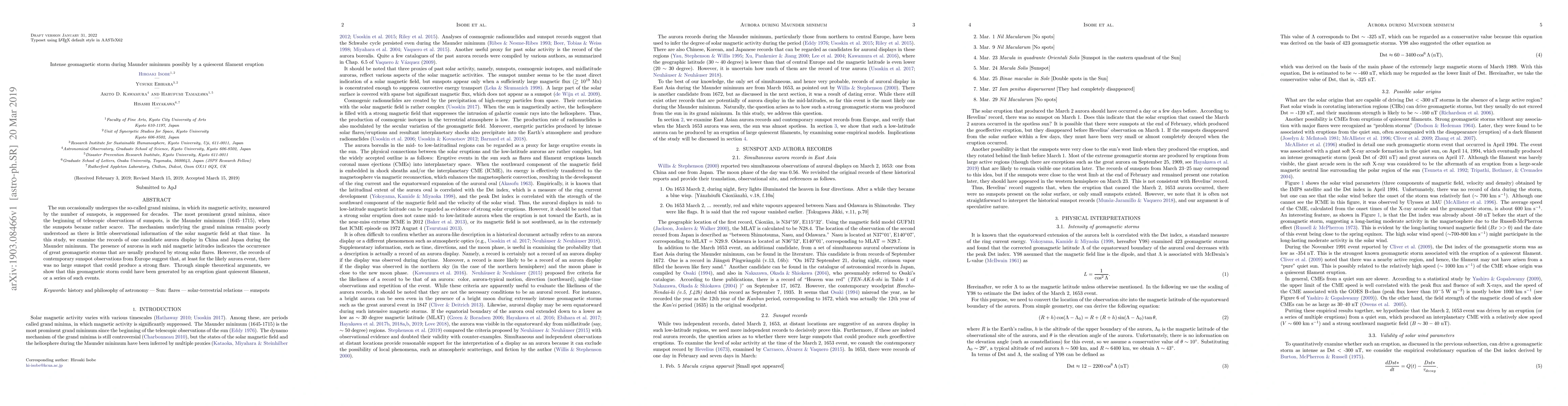 The sun occasionally undergoes the so-called grand minima, in which its magnetic activity, measured by the number of sunspots, is suppressed for decades. The most prominent grand minima, since the beginning of telescopic observations of sunspots, is the Maunder minimum (1645-1715), when the sunspots became rather scarce. The mechanism underlying the grand minima remains poorly understood as there is little observational information of the solar magnetic field at that time. In this study, we examine the records of one candidate aurora display in China and Japan during the Maunder minimum. The presence of auroras in such mid magnetic latitudes indicates the occurrence of great geomagnetic storms that are usually produced by strong solar flares. However, the records of contemporary sunspot observations from Europe suggest that, at least for the likely aurora event, there was no large sunspot that could produce a strong flare. Through simple theoretical arguments, we show that this geomagnetic storm could have been generated by an eruption giant quiescent filament, or a series of such events.