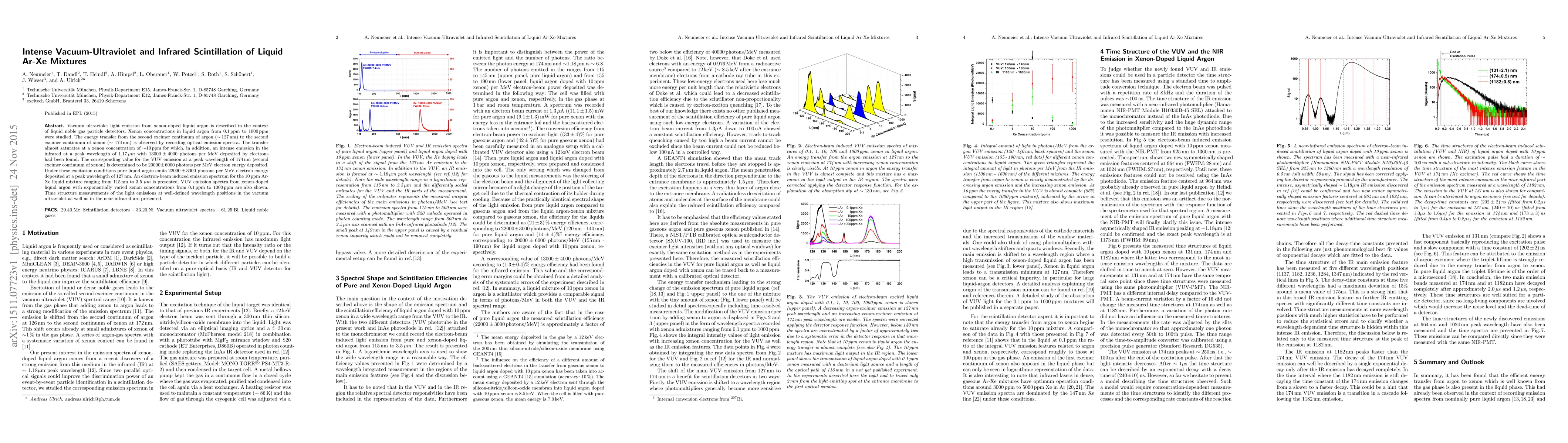 This research investigates the scintillation properties of liquid Ar-Xe mixtures under vacuum ultraviolet (VUV) and infrared (IR) excitation, finding significant scintillation intensity at xenon concentrations around 10 ppm. The study reveals strong VUV emission from the second excimer continuum of xenon and intense IR emission at 1.17 μm, indicating potential applications in particle detection.