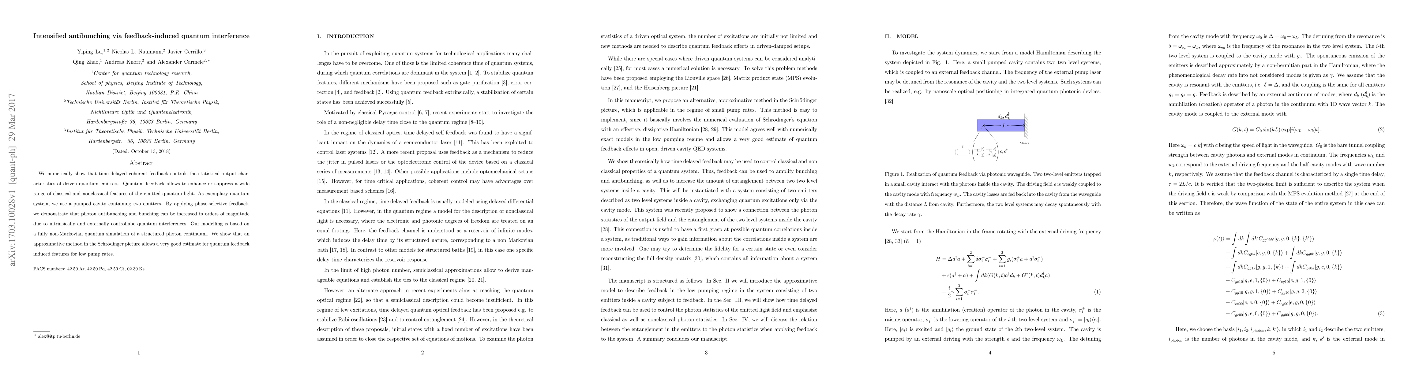 This research demonstrates that time-delayed coherent feedback can significantly enhance or suppress antibunching and bunching in quantum light emitted from a pumped cavity with two emitters, through controllable quantum interference. The study uses non-Markovian quantum simulations to model these effects, showing that an approximate method in the Schrödinger picture provides accurate estimates for low pump rates.