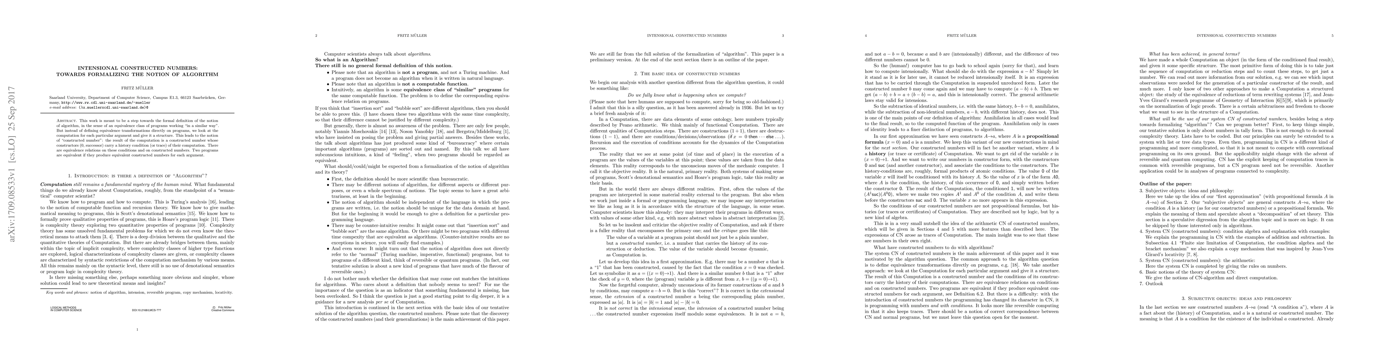 This work is meant to be a step towards the formal definition of the notion of algorithm, in the sense of an equivalence class of programs working "in a similar way". But instead of defining equivalence transformations directly on programs, we look at the computation for each particular argument and give it a structure. This leads to the notion of constructed number: the result of the computation is a constructed number whose constructors (0, successor) carry a history condition (or trace) of their computation. There are equivalence relations on these conditions and on constructed numbers. Two programs are equivalent if they produce equivalent constructed numbers for each argument.