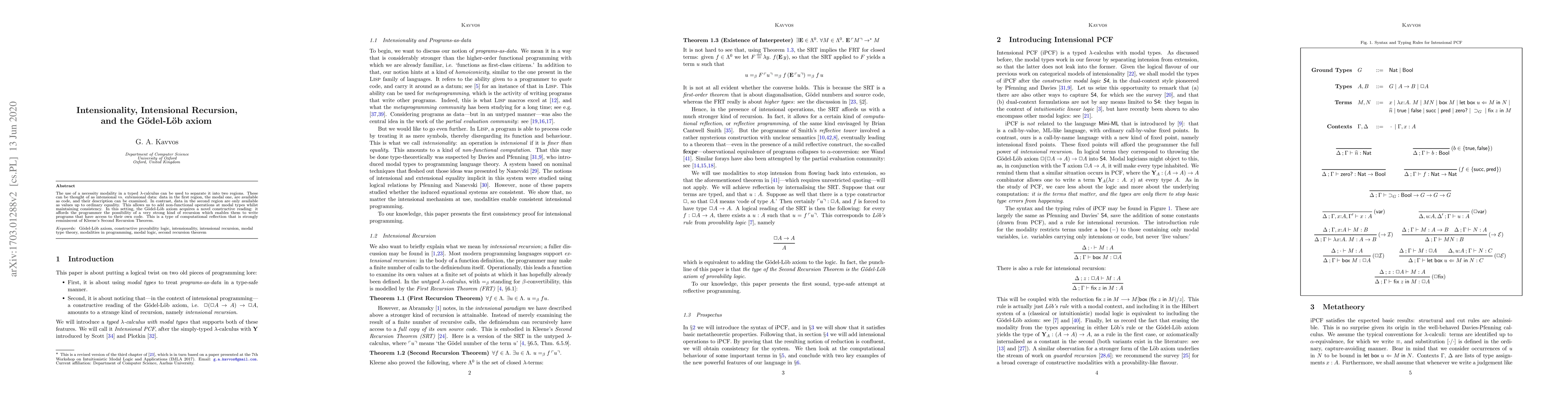 This paper explores the use of necessity modality in typed $\lambda$-calculus to distinguish between intensional and extensional data, allowing non-functional operations at modal types while preserving consistency. The Gödel-Löb axiom is reinterpreted constructively, enabling powerful self-referential recursion akin to Kleene's Second Recursion Theorem.