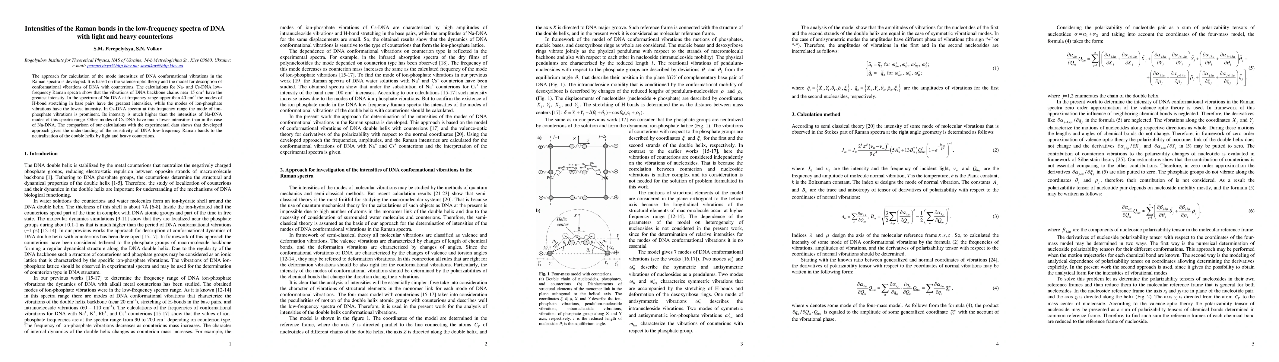 This paper develops a theoretical approach to calculate DNA conformational vibration intensities in Raman spectra, revealing that DNA backbone vibrations near 15 cm-1 are most intense. It shows that Na-DNA has prominent H-bond stretching modes above 40 cm-1, while Cs-DNA exhibits stronger ion-phosphate vibration modes in the same range, indicating a sensitivity difference to counterions.