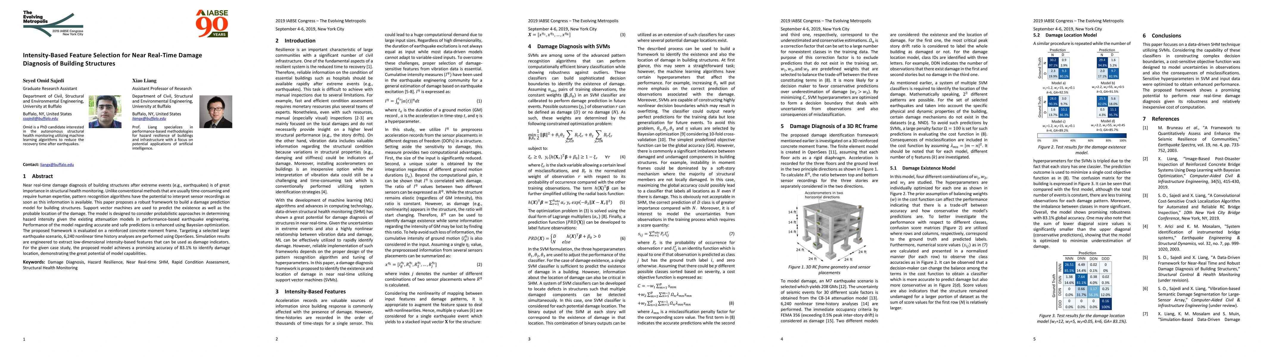 This paper proposes a robust framework for near real-time damage diagnosis in building structures post-extreme events using intensity-based feature selection and support vector machines. The model, enhanced by Bayesian optimization, achieves 83.1% accuracy in identifying damage location in a reinforced concrete moment frame.