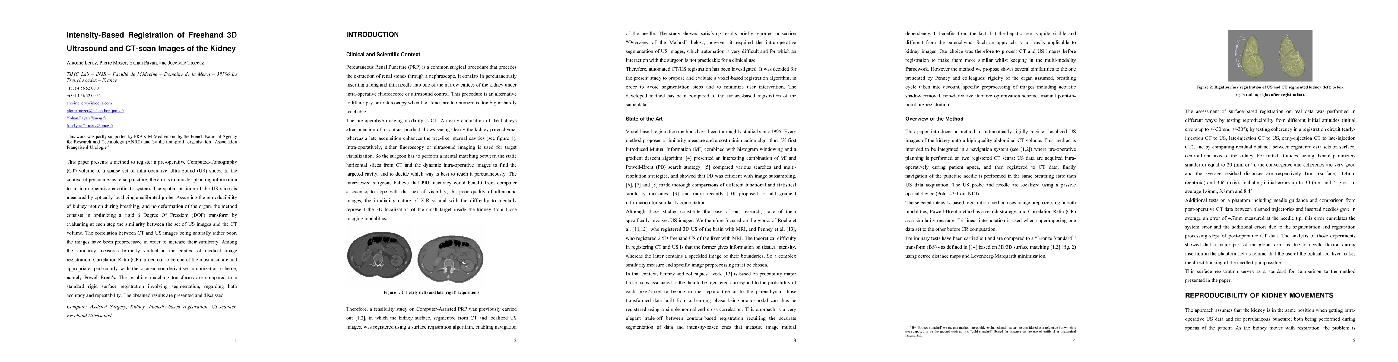 This paper proposes a method for registering pre-operative CT scans to intra-operative US slices for percutaneous renal puncture, optimizing a rigid 6 DOF transform using Correlation Ratio for image similarity. The method's accuracy and repeatability are compared to standard rigid surface registration.