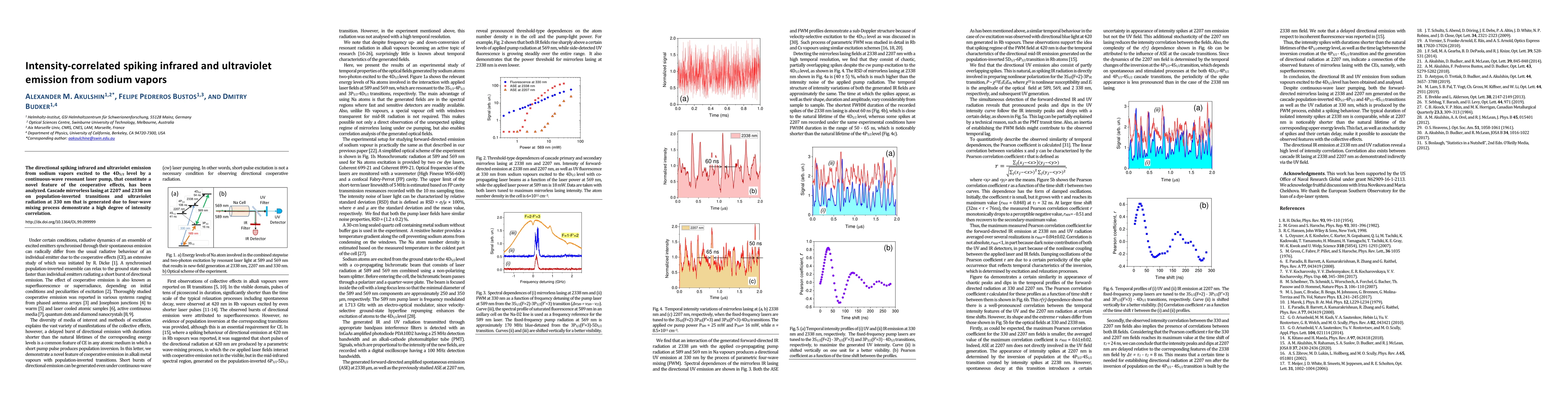 This paper investigates the intensity-correlated spiking infrared and ultraviolet emissions from sodium vapors excited by a resonant laser, revealing novel cooperative effects, including cascade mirrorless lasing and ultraviolet radiation via four-wave mixing, showing strong intensity correlation.