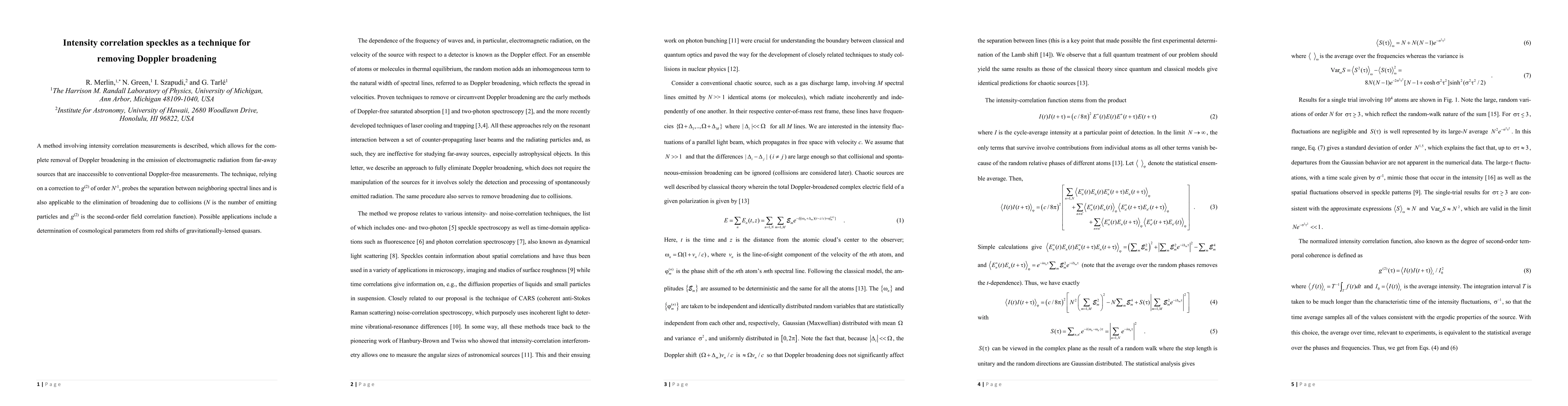 A method involving intensity correlation measurements is described, which allows for the complete removal of Doppler broadening in the emission of electromagnetic radiation from far-away sources that are inaccessible to conventional Doppler-free measurements. The technique, relying on a correction to g(2) of order N-1, probes the separation between neighboring spectral lines and is also applicable to the elimination of broadening due to collisions (N is the number of emitting particles and g(2) is the second-order field correlation function). Possible applications include a determination of cosmological parameters from red shifts of gravitationally-lensed quasars.